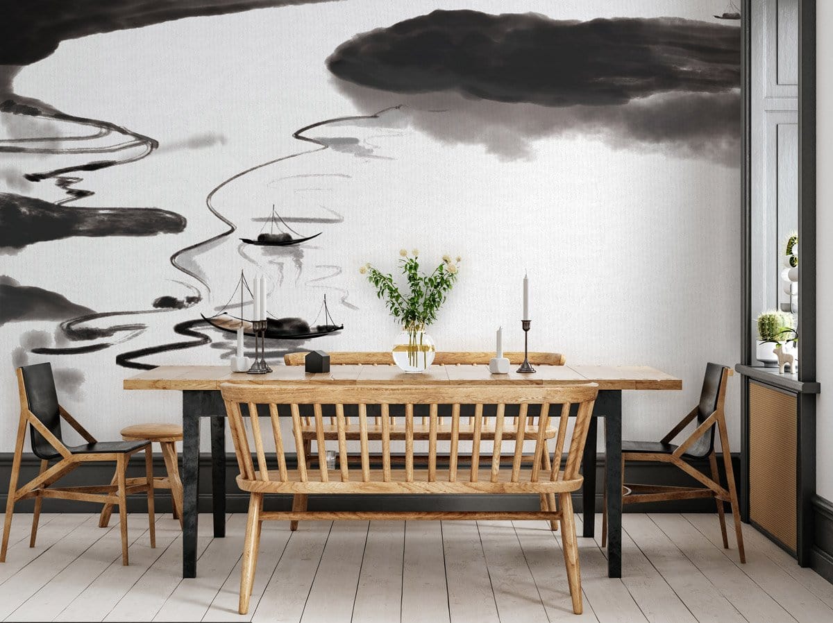 If you are looking for a simple hand-drawn black and white wallpaper mural, you are in the right place. This wallpaper simply use black to portray a beautiful mountain and lake landscape with some boats on it. This creative piece of art in water colour effect will surely add a touch of peace and comfort to your home. Use this in your living room, bedroom and home office to level up your space.