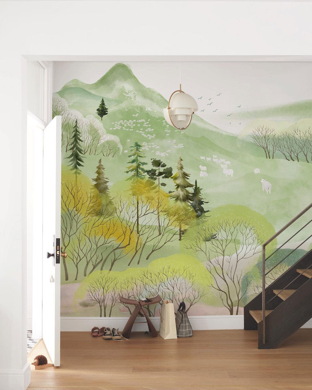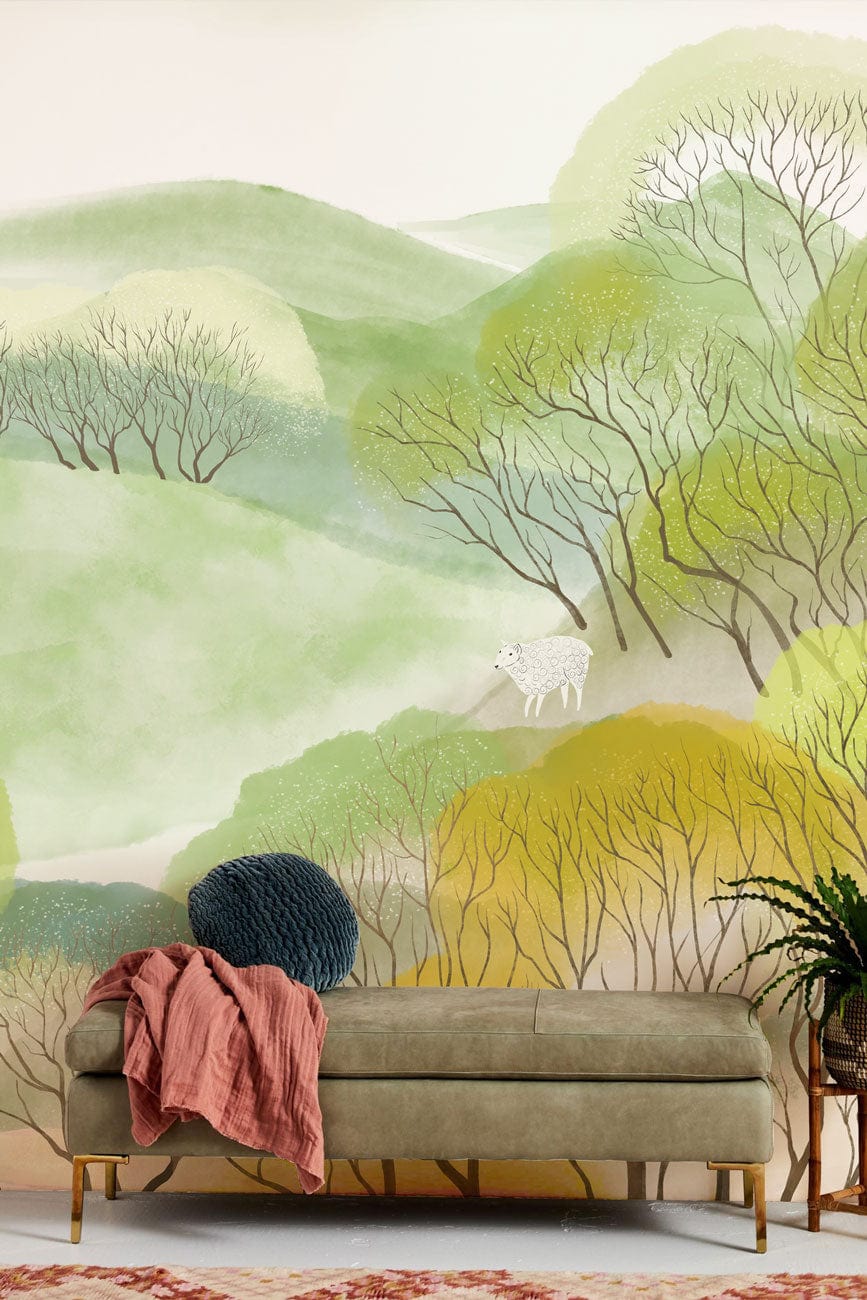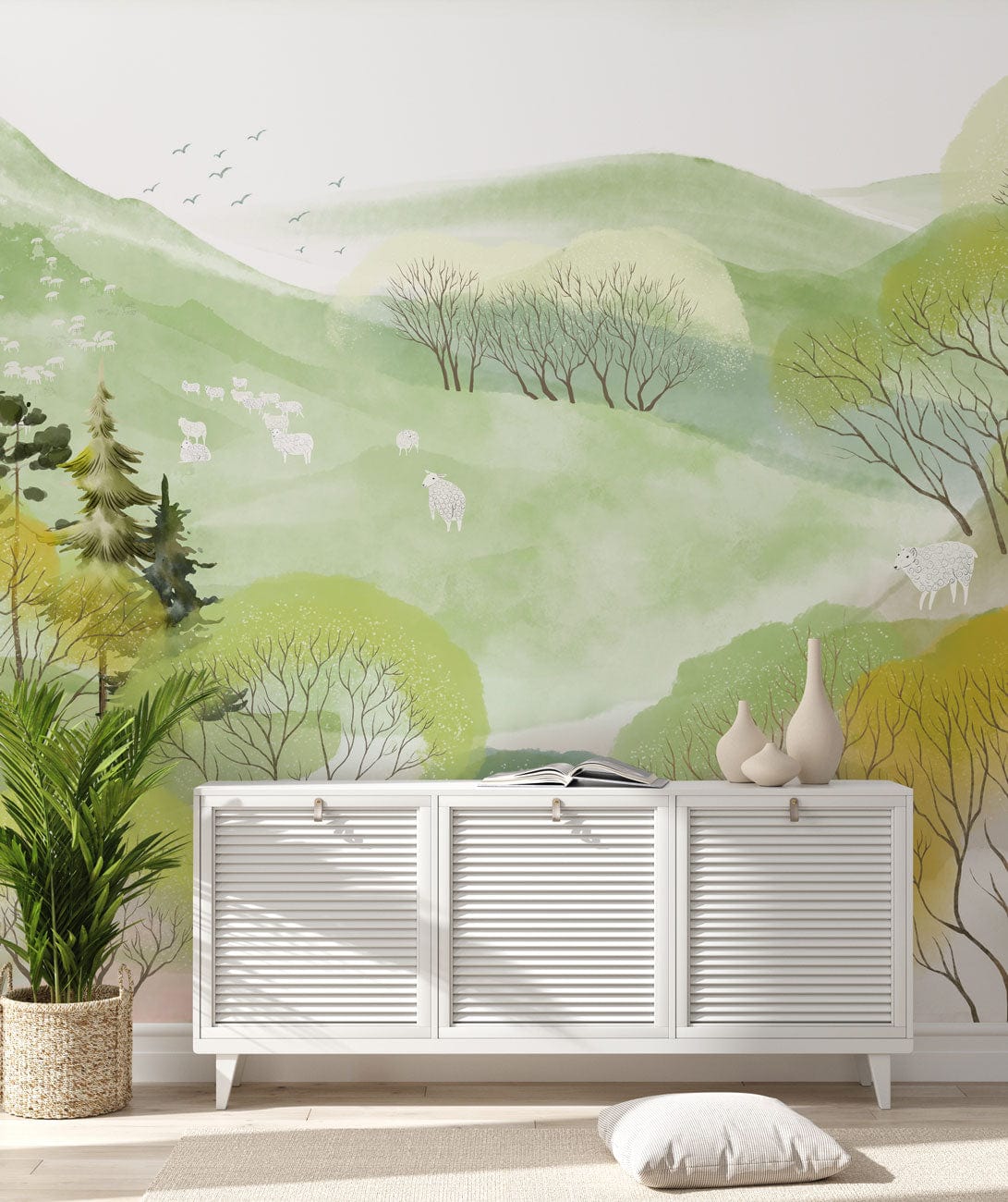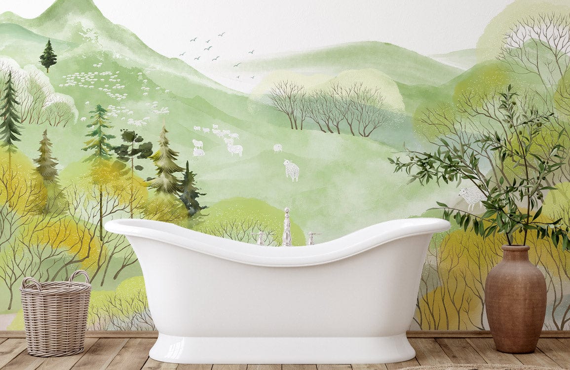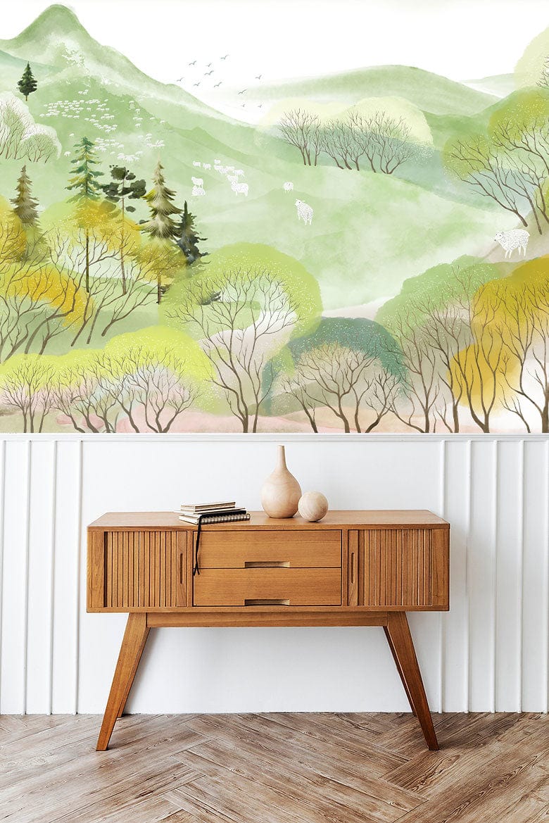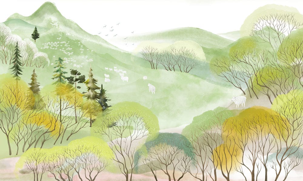 Immerse your space in the tranquillity of nature with this Watercolour Scenery Wallpaper Mural. The mural features a serene landscape of rolling hills and delicate trees, creating a gentle flow of lines that offer a refined natural aesthetic. Its evocative depiction brings a calming ambience suitable for any interior, making it a sophisticated addition to both modern and classic settings.