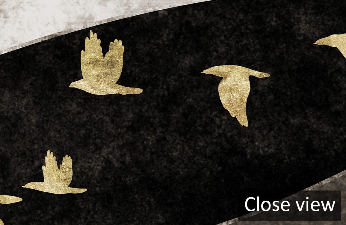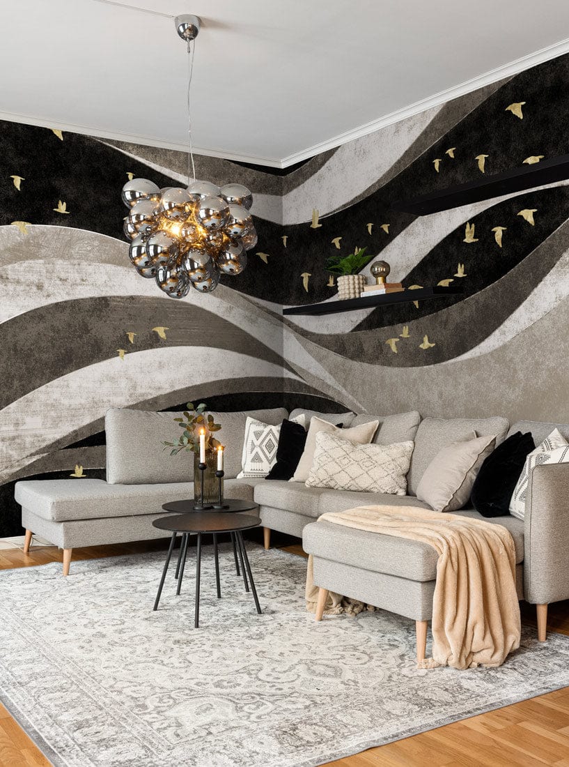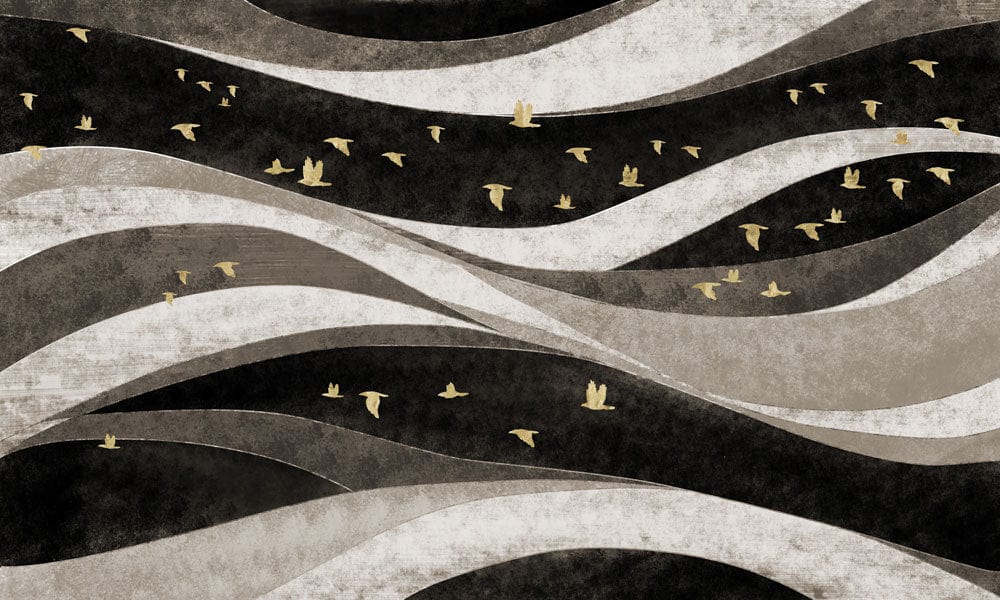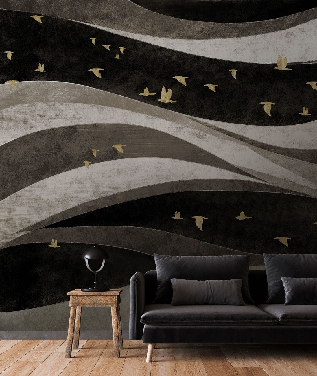 This mural wallpaper seamlessly melds art and nature, featuring graceful birds in flight across rhythmic waves. Its refined design is punctuated with golden accents, creating a harmonious balance that elevates any space with understated elegance.