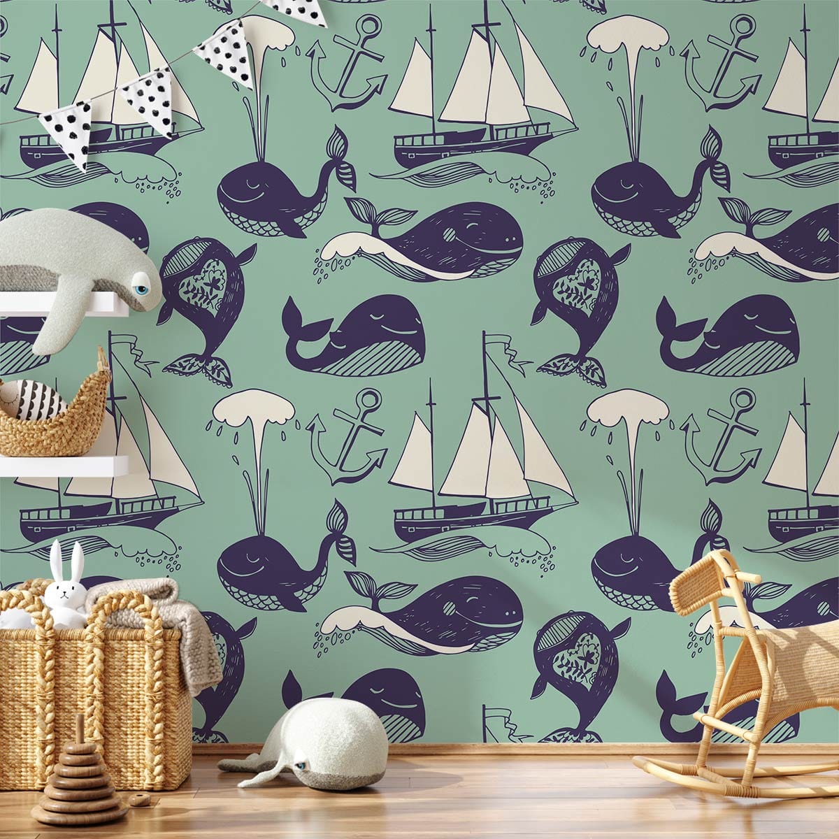 Against the green- colour background, the blue whales swim freely in the sea. The ships sail bravely on the waves. When you install this wallpaper mural in your room, you put yourself in a world of the beautiful and happy ocean. Create a cool space with this lovely and cheerful wallpaper mural and enjoy the happiness it brings to you and your kids. It鈥檚 a fun design that will add a new dynamic to your bedroom,great for kids, teens or anyone who is loving the exciting new trend of whales.