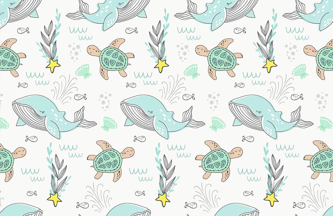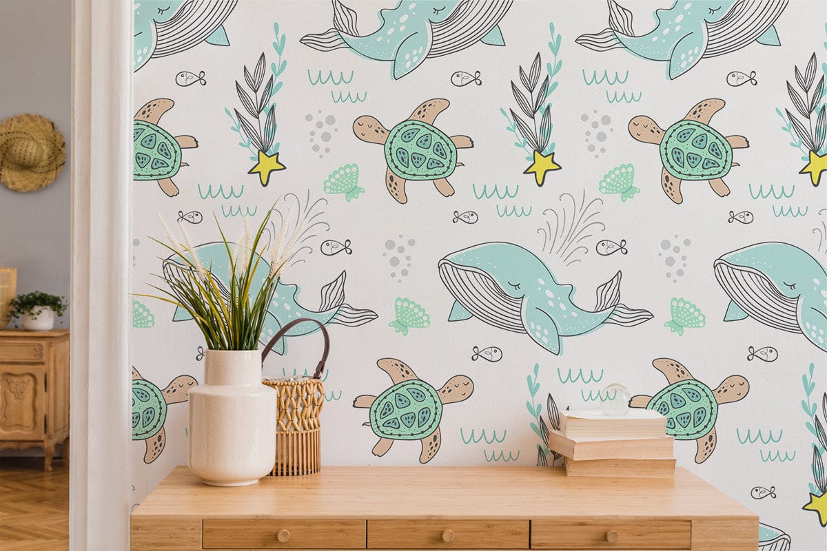 Dive into a whimsical oceanic journey with this mural featuring gentle whales and playful turtles in soothing pastel hues. The delicate illustrations and subtle textures evoke a serene maritime ambience, enriching any space with a sense of calm and wonder.
