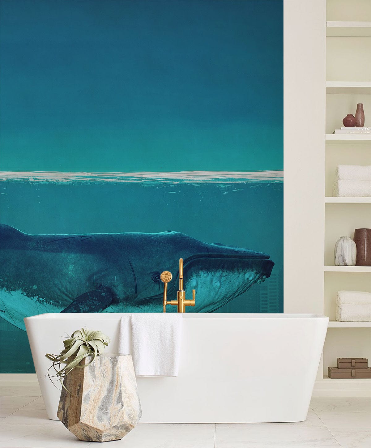 Immerse your space in serene sophistication with the Whale in Ocean City Wallpaper Mural. This artwork masterfully blends a majestic whale gliding through the ocean against a subtle cityscape backdrop. The harmonious composition of deep teal hues and gentle urban silhouettes crafts an exquisite balance of nature and architecture. Its elegant design and rich textures invite timeless beauty into any interior, offering a tranquil yet dynamic atmosphere.