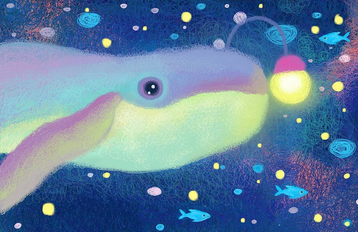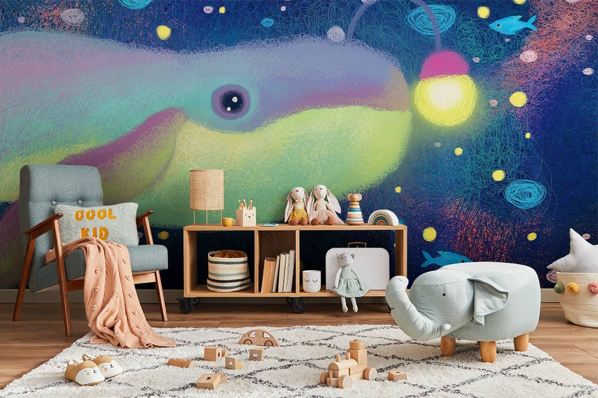 Light up your home with our Whale Lamp Mural Wallpaper! A vibrant, playful cartoon wallpaper designed with cute and whimsical whale guided by a bright light in vivid colours and soft lines. This animal mural will give life to your child's room and add a touch of style and ocean flair. Perfect for any space that needs a bold and beautiful pop, it will surely be a conversation starter for your child's friends and will bring a smile to everyone's faces.