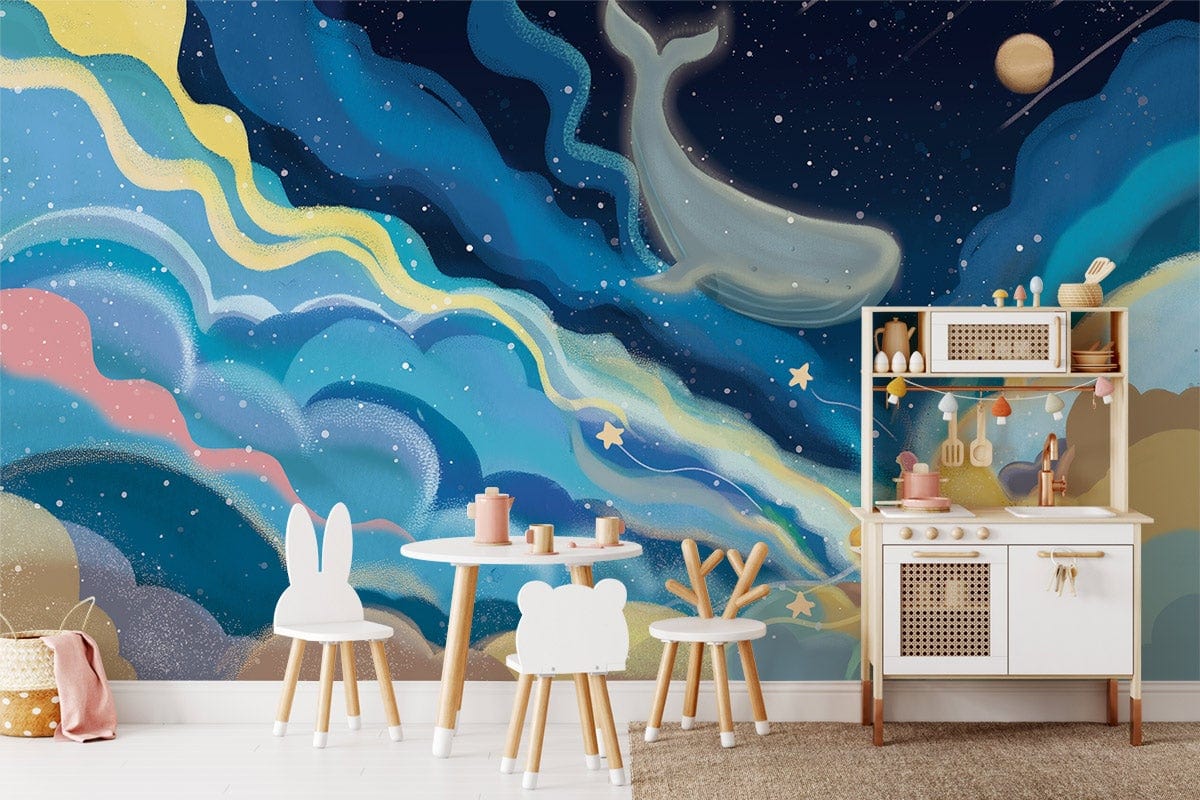 Embrace the serene blend of imagination and elegance with the Whale & Shooting Star Wallpaper Mural. This design captures a dreamlike scene where a majestic whale glides through a cosmic sky filled with shooting stars. Delicate stardust trails weave through vibrant waves of blues and soft pastels, creating a captivating ambience that suits a variety of settings. Whether in a child's bedroom or a sophisticated lounge, this mural infuses any space with an artistic and timeless allure.