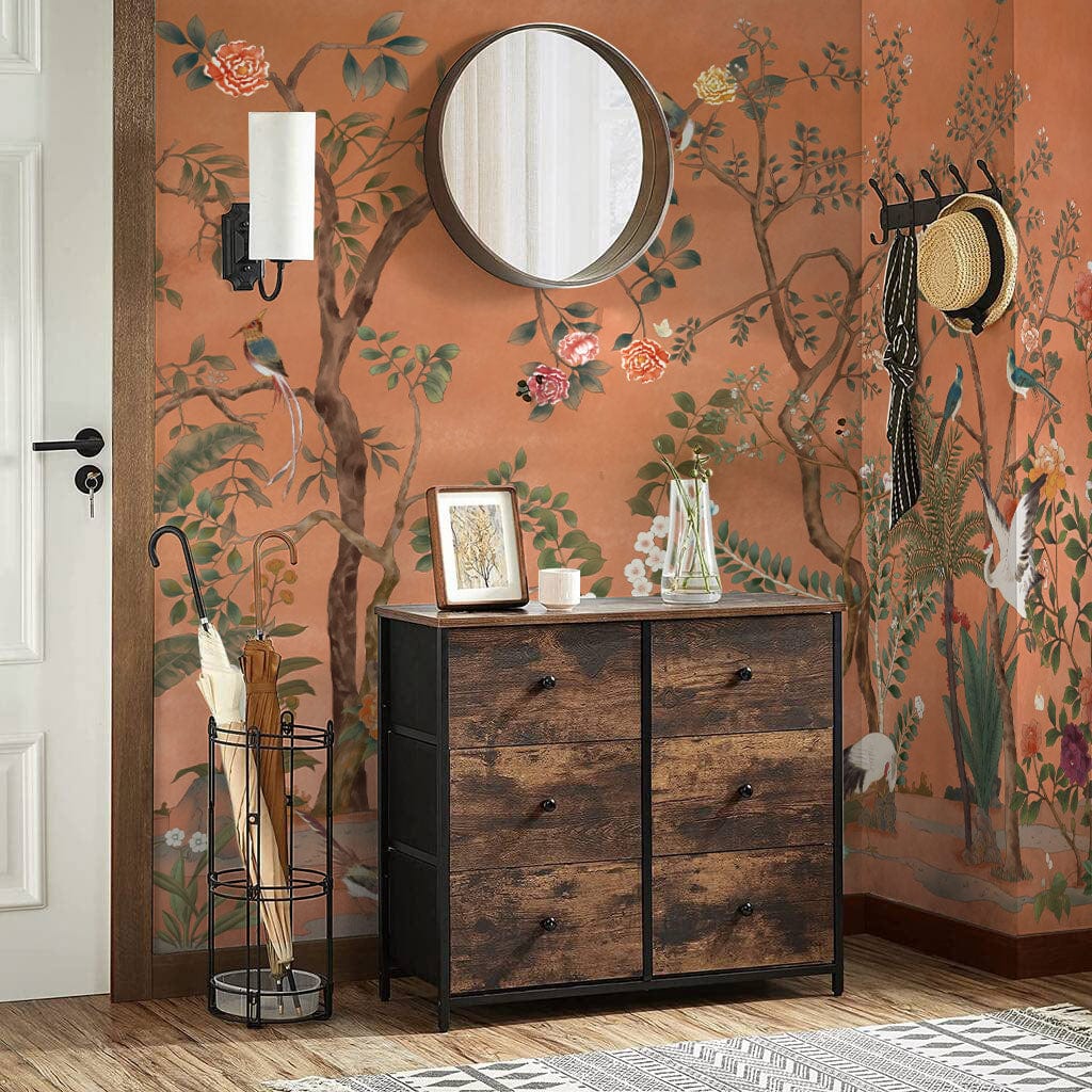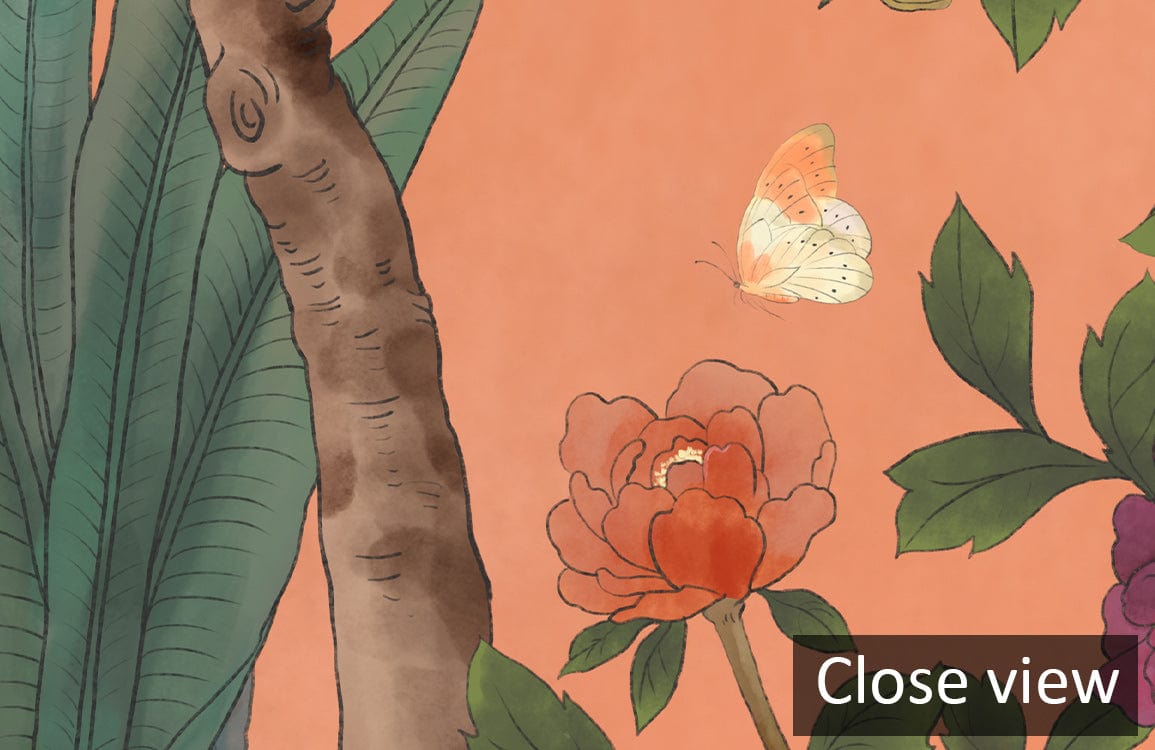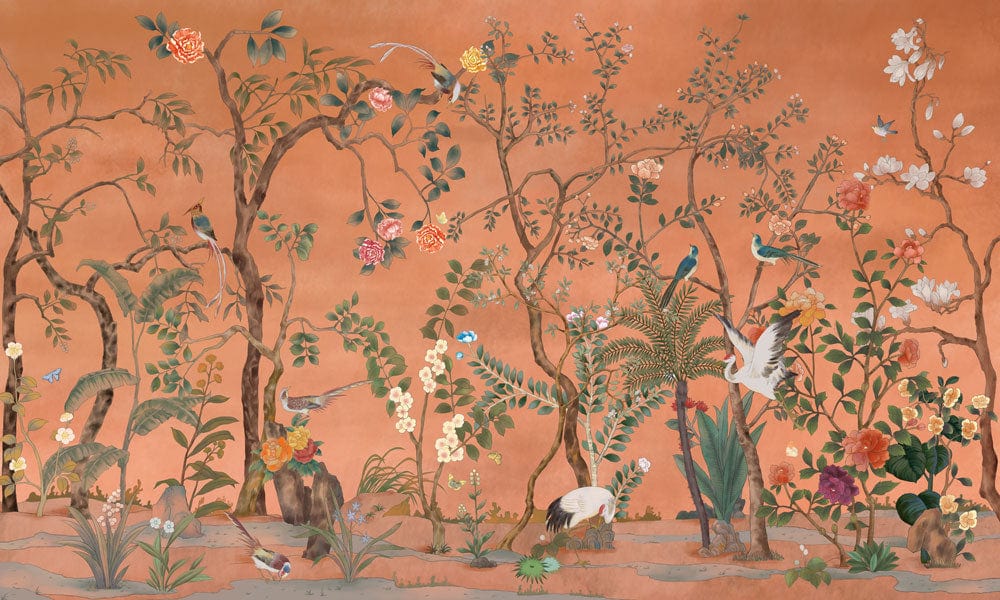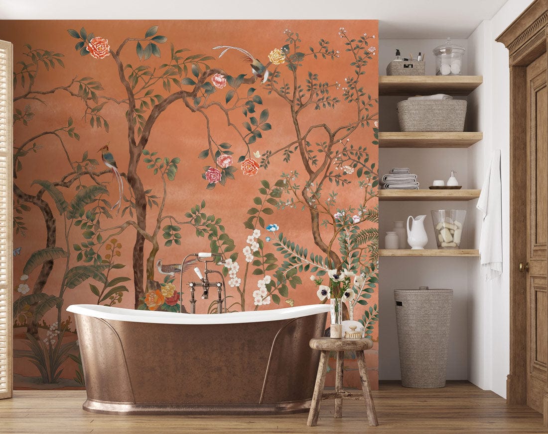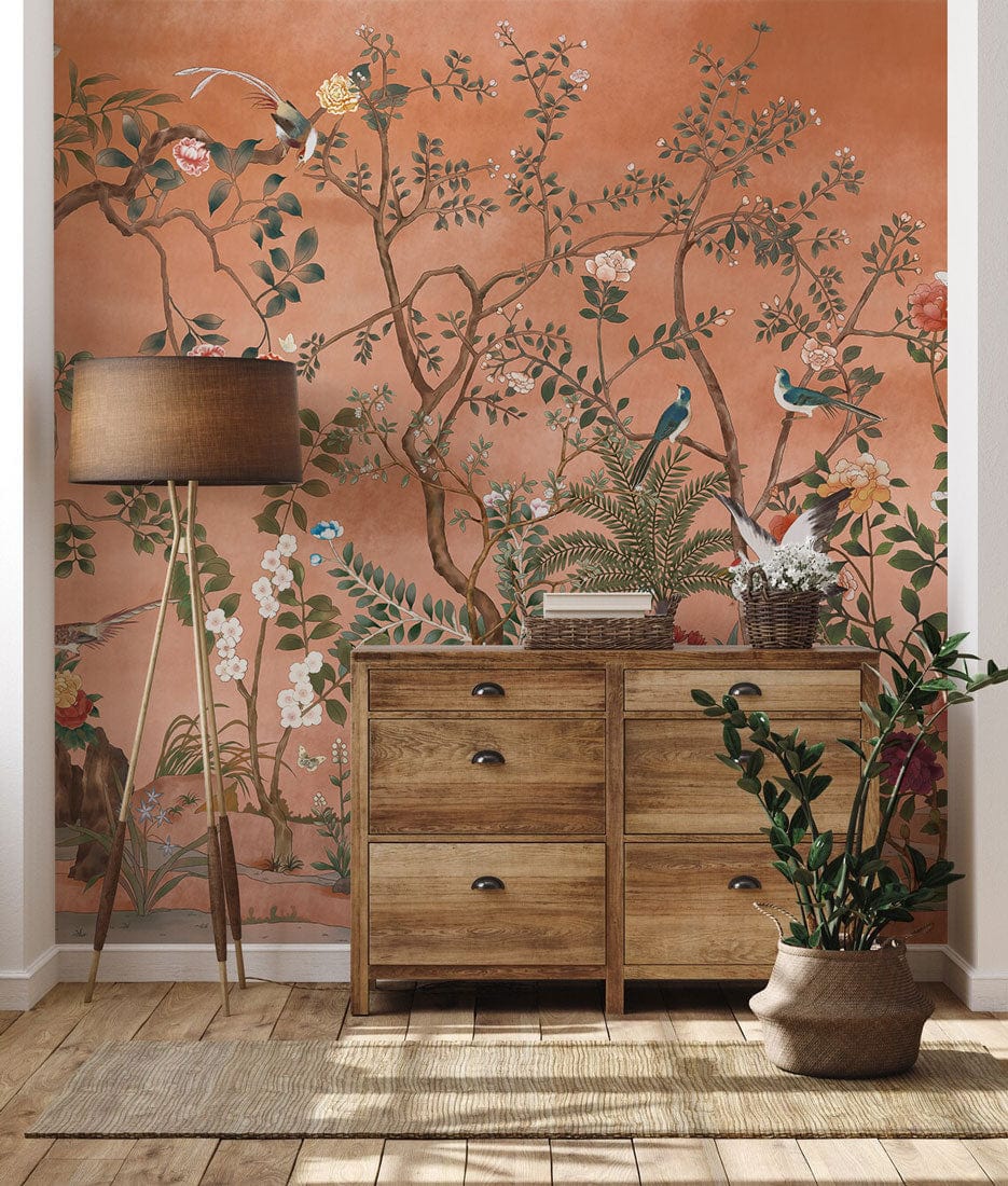 Immerse your space in the exquisite elegance of the Whimsical Birdsong Mural Wallpaper. This masterpiece captures an idyllic scene of delicately illustrated birds cavorting amidst lush foliage and vibrant blossoms, set against a rich terracotta backdrop. The intricate detailing and harmonious blend of nature's elements evoke a sense of tranquillity and sophistication, making it a superb choice for diverse environments from a classic study to a contemporary living room.
