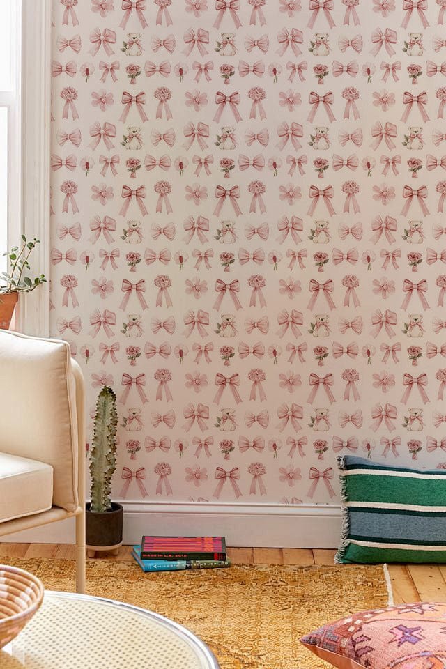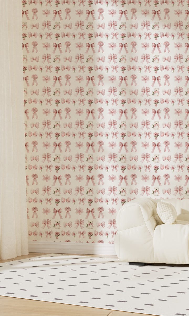 Delight in the charm of the Whimsical Bows and Blooms Mural Wallpaper, where delicate bows interlace with soft floral motifs, casting an atmosphere of grace and sophistication. The detailed design evokes an artistic allure, subtly textured to capture the essence of timeless beauty. Perfectly suited for elegant interiors, it harmonises effortlessly within diverse spaces, infusing your environment with a serene yet vibrant ambience.