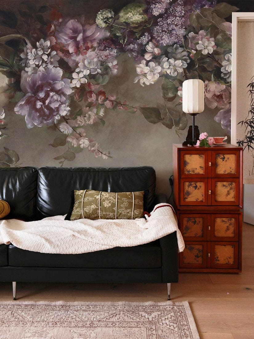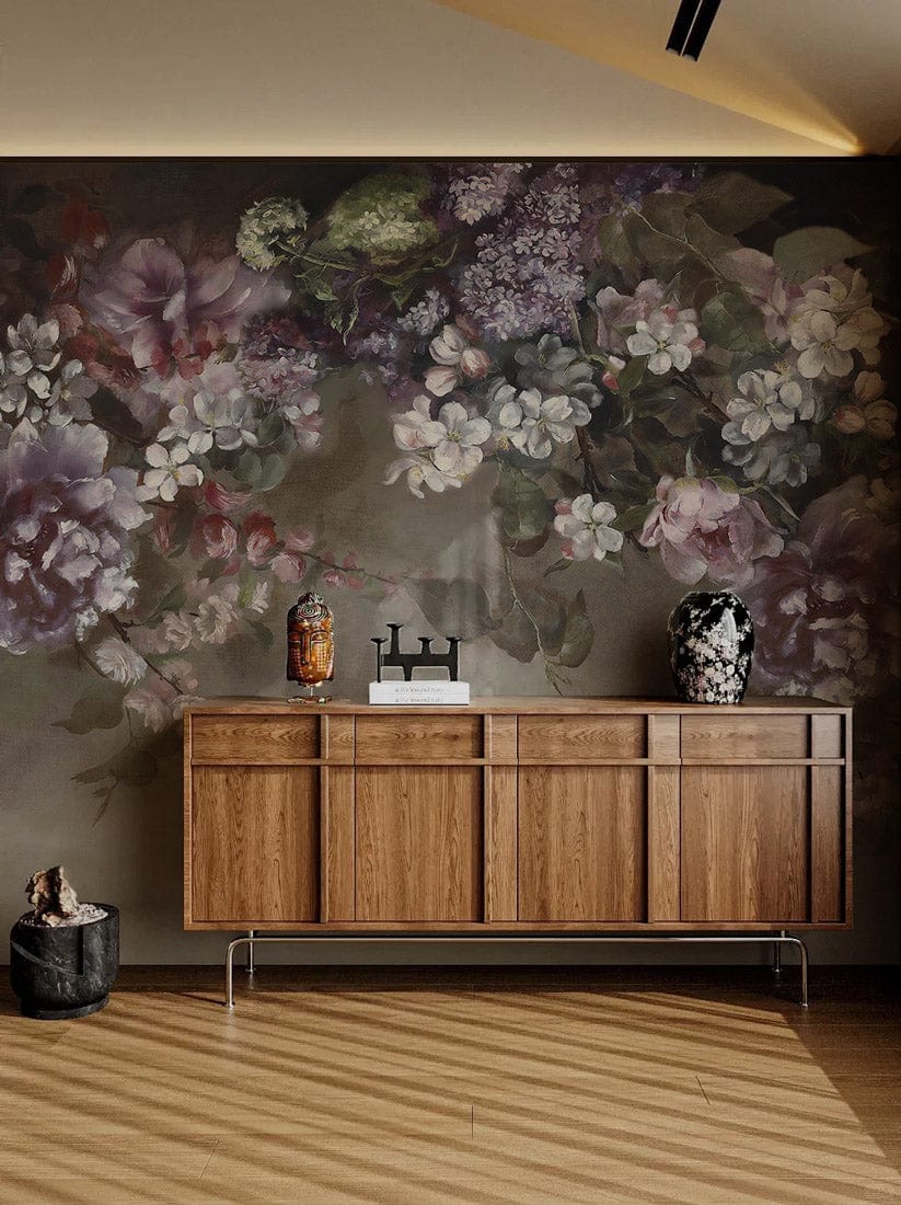 Immerse your space in the delicate elegance of the Whispers of Spring mural wallpaper, where cascading florals in soft pastels create a sense of serenity and timeless beauty. This exquisite design features intricate blooms and lush greenery against a gentle backdrop, offering a touch of nature's artistry. Its subtle sophistication makes it an ideal choice for elevating various interiors.