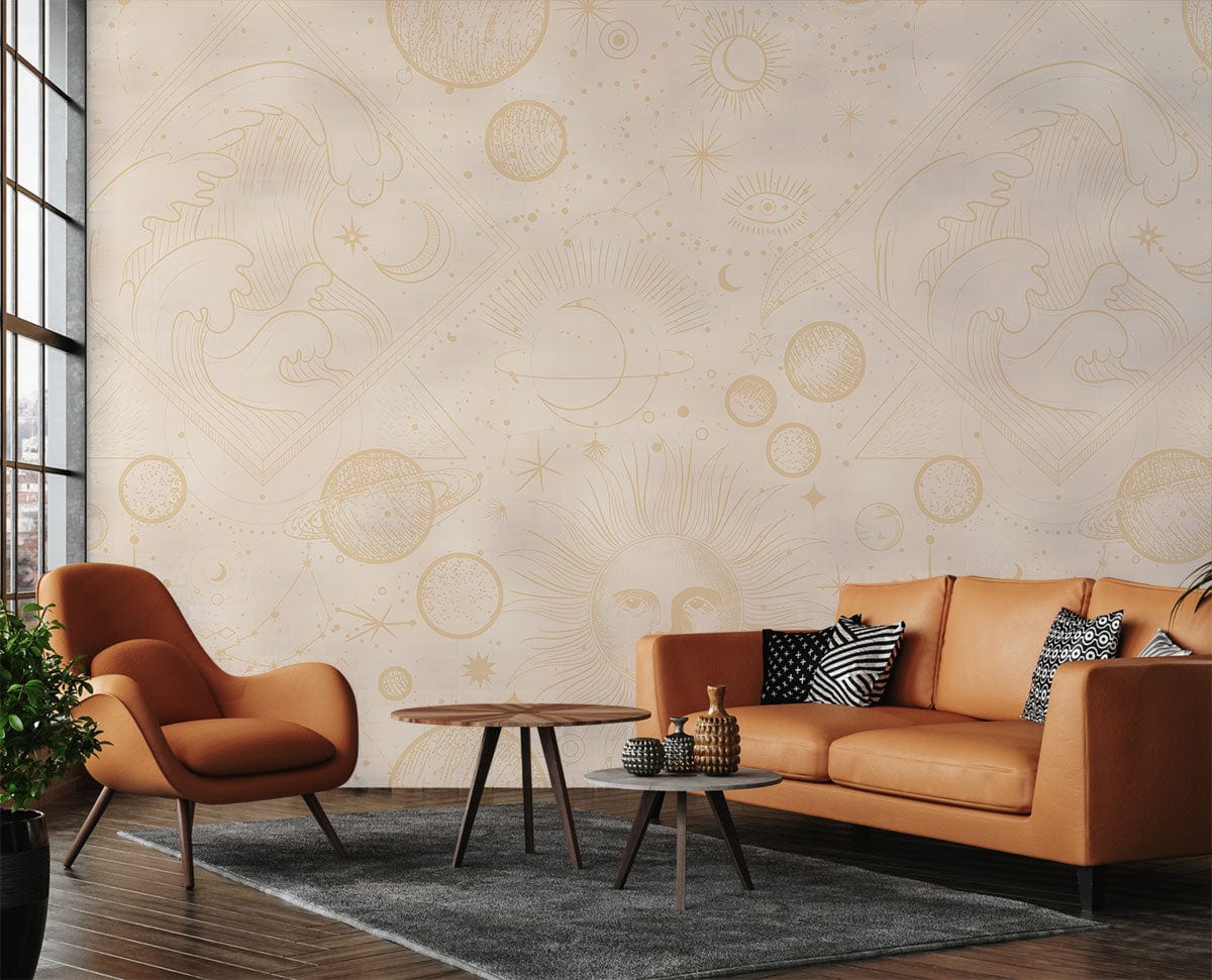Immerse your space in celestial elegance with the White Astrology & Sun Wallpaper Mural, featuring intricate golden sun motifs and delicate astrological symbols. Its subtle artistry and harmonic textures invite a serene yet sophisticated ambiance, seamlessly integrating into any modern or vintage-inspired setting.