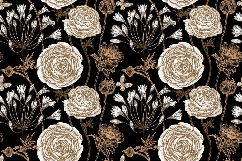 The White Blossom Wallpaper Mural captures the essence of classic elegance with its intricate floral design, featuring blooming white flowers set against a striking black background. The artwork's meticulous detail and subtle contrast add depth and sophistication, making it an exquisite choice for enriching any interior. Perfectly suited for creating a serene ambience, it marries timeless artistry with modern aesthetics, effortlessly complementing spaces with its refined charm.