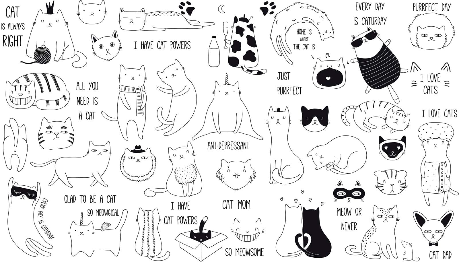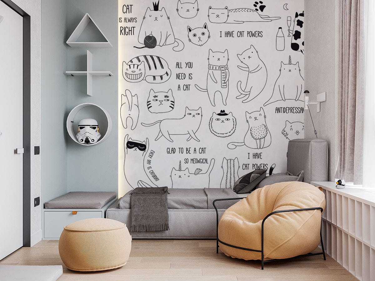 With our White Cat Pattern Wallpaper Mural is a lively and colourful way to liven up any area in your house. The modern cat wallpaper features adorable cats in various amusing moods and attitudes, making it ideal for kids' rooms! This animal wallpaper, which comes in a simple black and white colour scheme, is sure to light up any room in your home or office, and you can enjoy many years of a great life with cats!