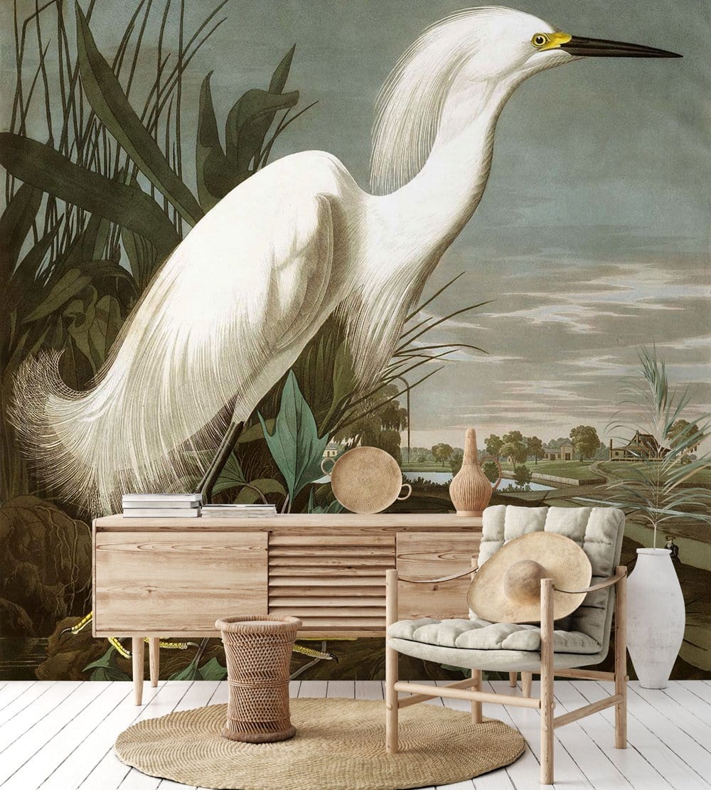 This white heron wallpaper mural is ideal decor to use as a background. This beautiful, amazing painting of a large white heron in the forest will be perfect for the indoors in your home. Interesting rendering with a natural atmosphere and a refreshing wall decoration perfect for any day and affable name: creatures with green scenes.