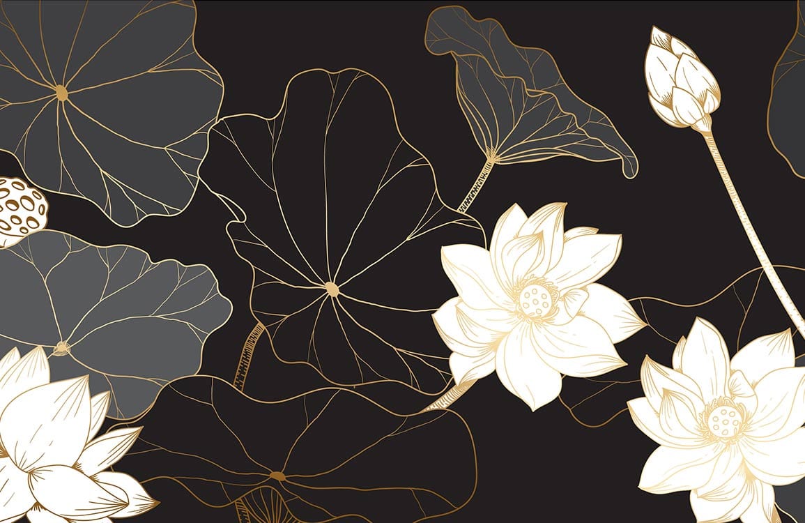 This exquisite White Lotus Flower Wallpaper Mural captivates with its intricate design, featuring delicate lotus blossoms elegantly set against a backdrop of rich, contrasting tones. The refined lines and subtle use of gold outlines create a sophisticated art piece that adapts seamlessly to a range of interior styles. Whether gracing a modern living space or providing a serene touch to a bedroom, this mural's timeless beauty and harmonious composition invite a sense of tranquillity and elegance.