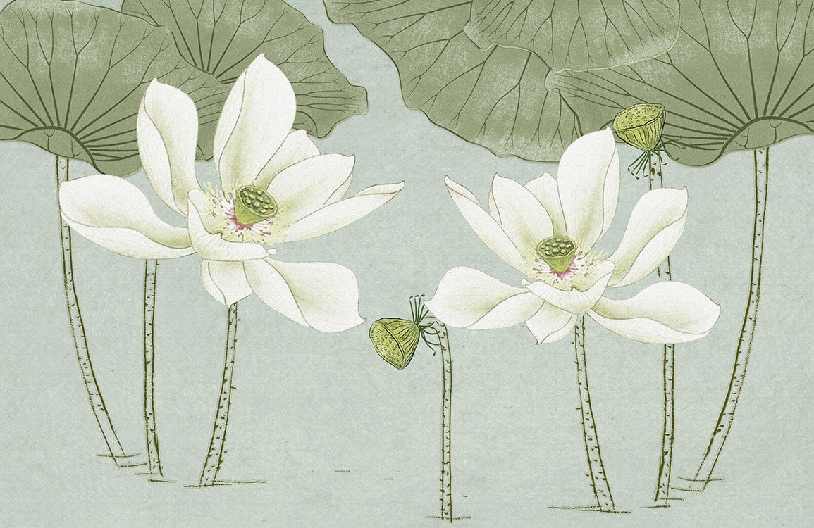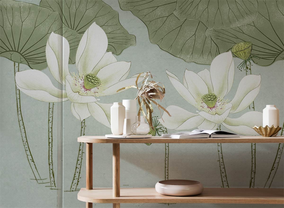Experience the serene elegance of the White Lotus Wallpaper Mural, where delicate lotus blooms and lush green leaves create a tranquil scene. The subtle interaction of creamy white petals with soft green and hints of pale pink provides a refreshing backdrop that energises and calms. Perfectly suited for accentuating spaces with its timeless charm, this mural brings an artistic depth that complements both contemporary and classic interiors.