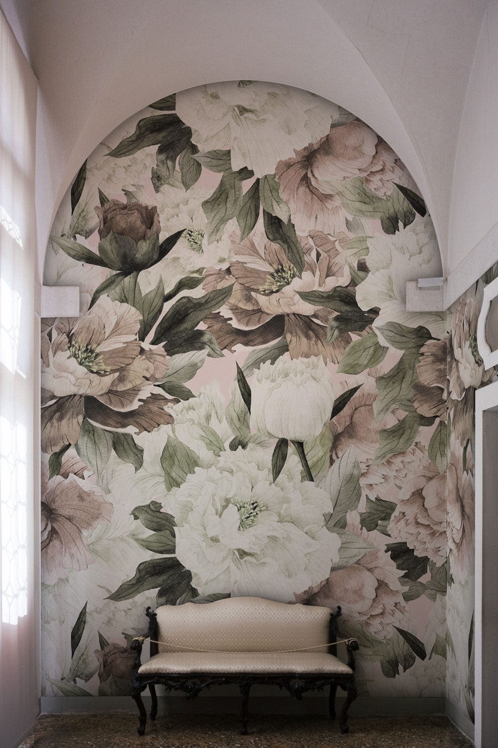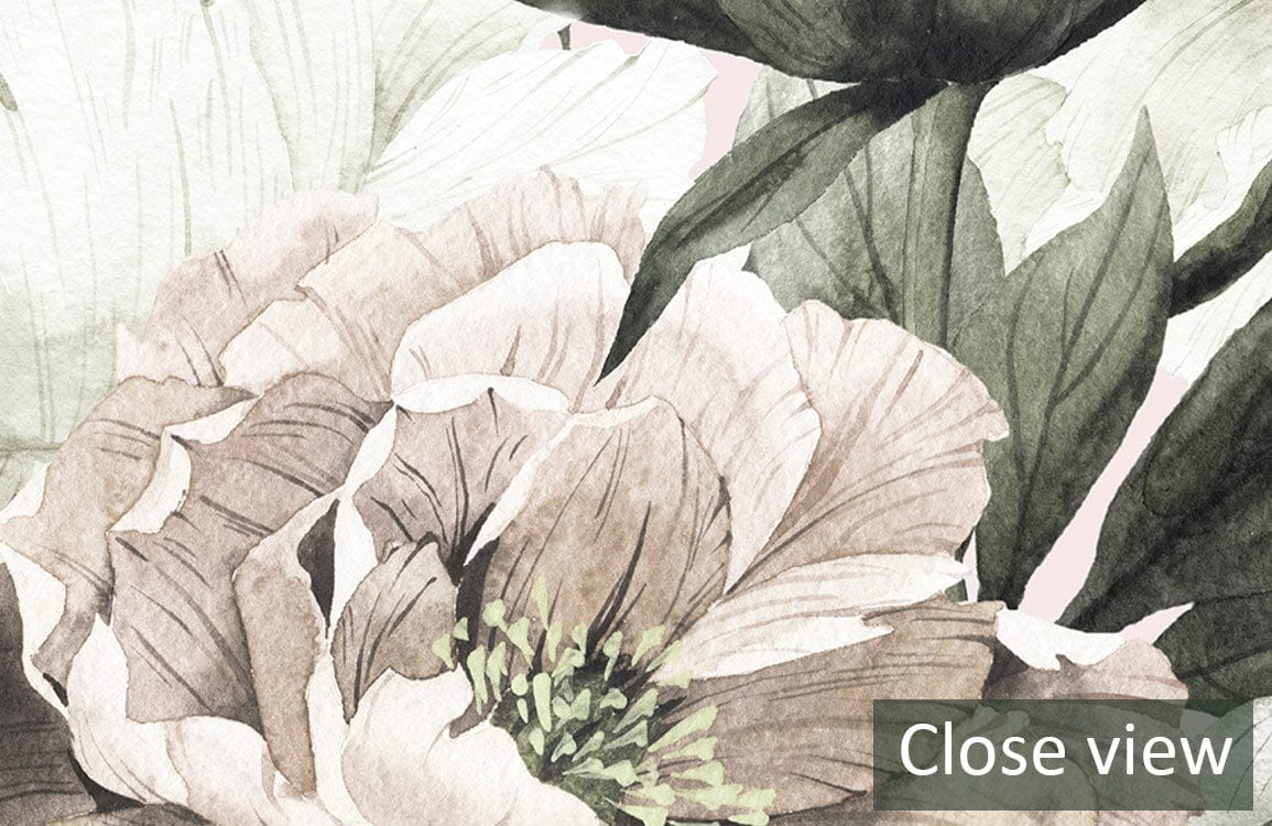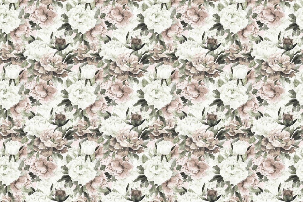 This exquisite wallpaper mural showcases an intricate design of white and neutral flowers, exuding elegance and sophistication. The gentle interplay of soft whites, muted greens, and subtle taupe hues bring a serene and refined ambience to any interior. Crafted with artistic precision, its textured floral patterns evoke a timeless appeal, making it a versatile choice for diverse settings.