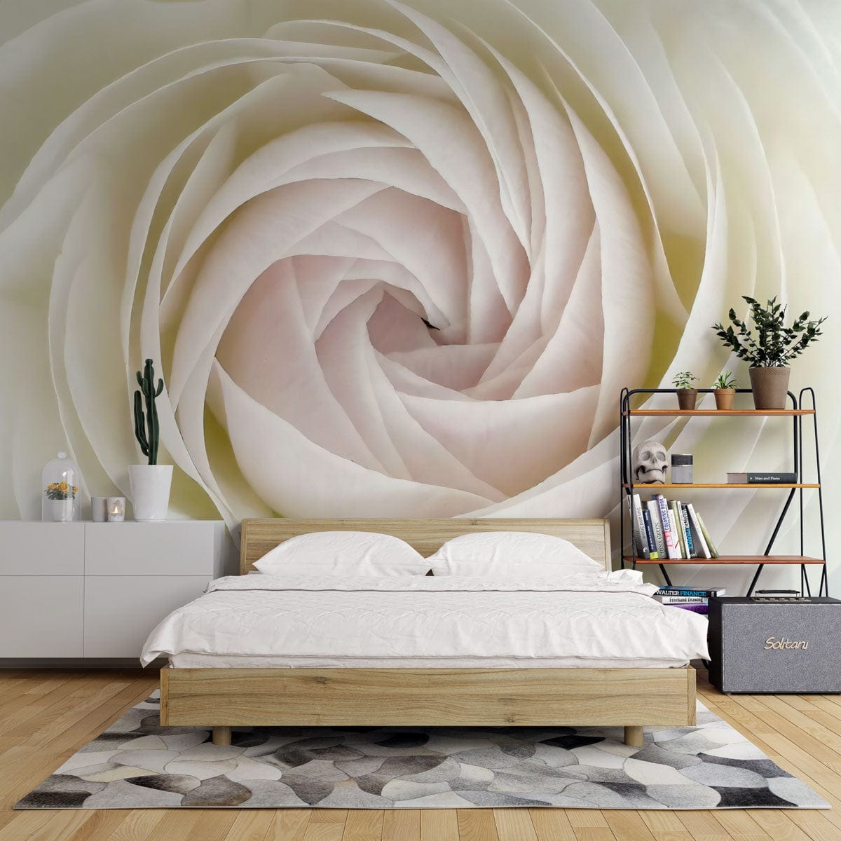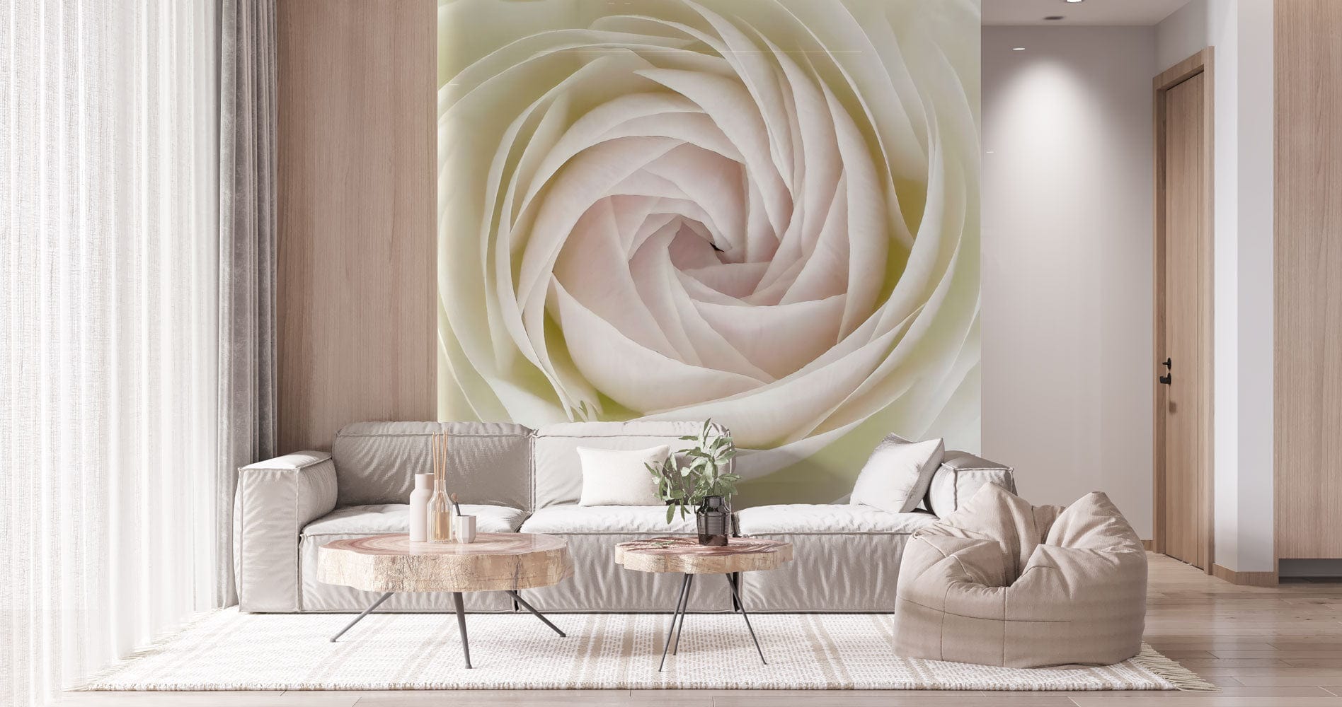 Discover the serene elegance of the White Rose Bud Wallpaper Mural. Its intricate spiral of petals in soft ivory hues creates a gentle yet striking visual, effortlessly capturing the timeless beauty of a blossoming rose. Perfect for those seeking a subtle but sophisticated aesthetic, this mural lends its charm to various settings, imbuing them with grace and tranquillity.
