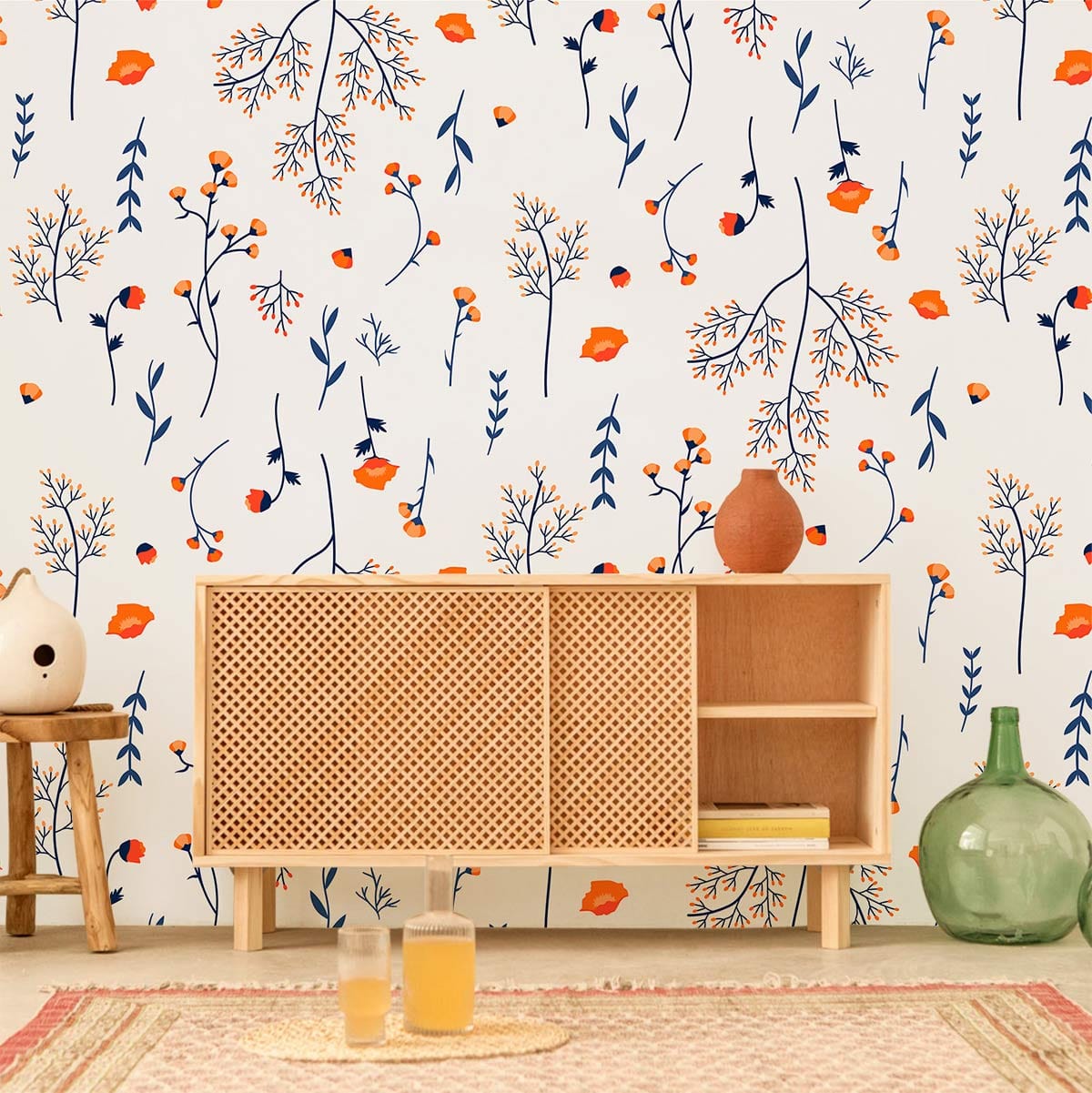 With clear fresh vibes embrace your home with these orange bright flowers. The mix between the dark blue and the orange is so perfect for your home decoration if you are a floral fan. Let your home bloom with our wild flowers鈥?mural wallpaper, this repeated pattern with the bright background will give you variety of option for decorating your space. This design is so ideal for your children鈥檚鈥?room if you are looking for a shiny design to give the feeling of freshness and gives the impression that the room is bigger because of the light touch in our mural. Style the mural with white chiffon curtains and let the breeze flow in your house and dance with these flowers.