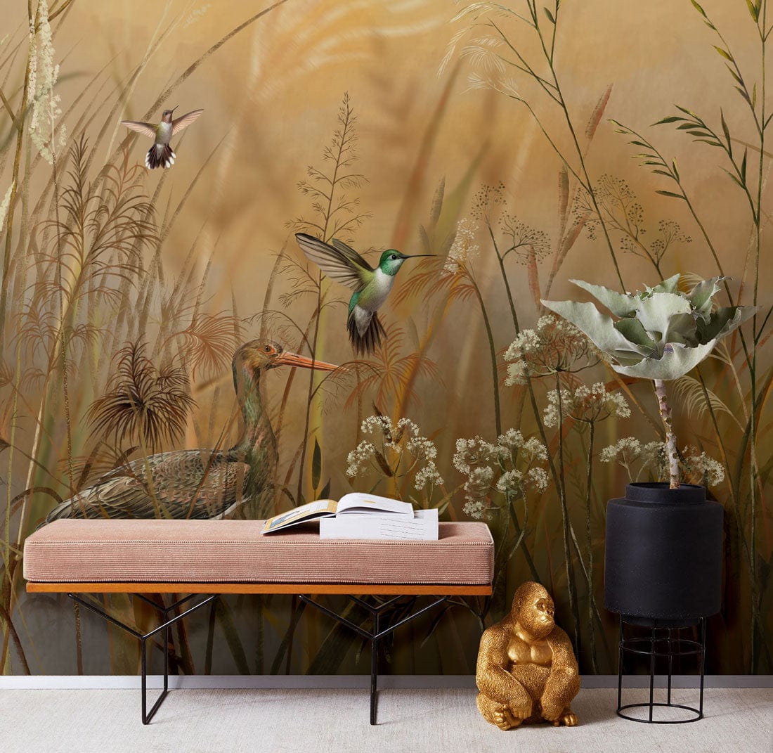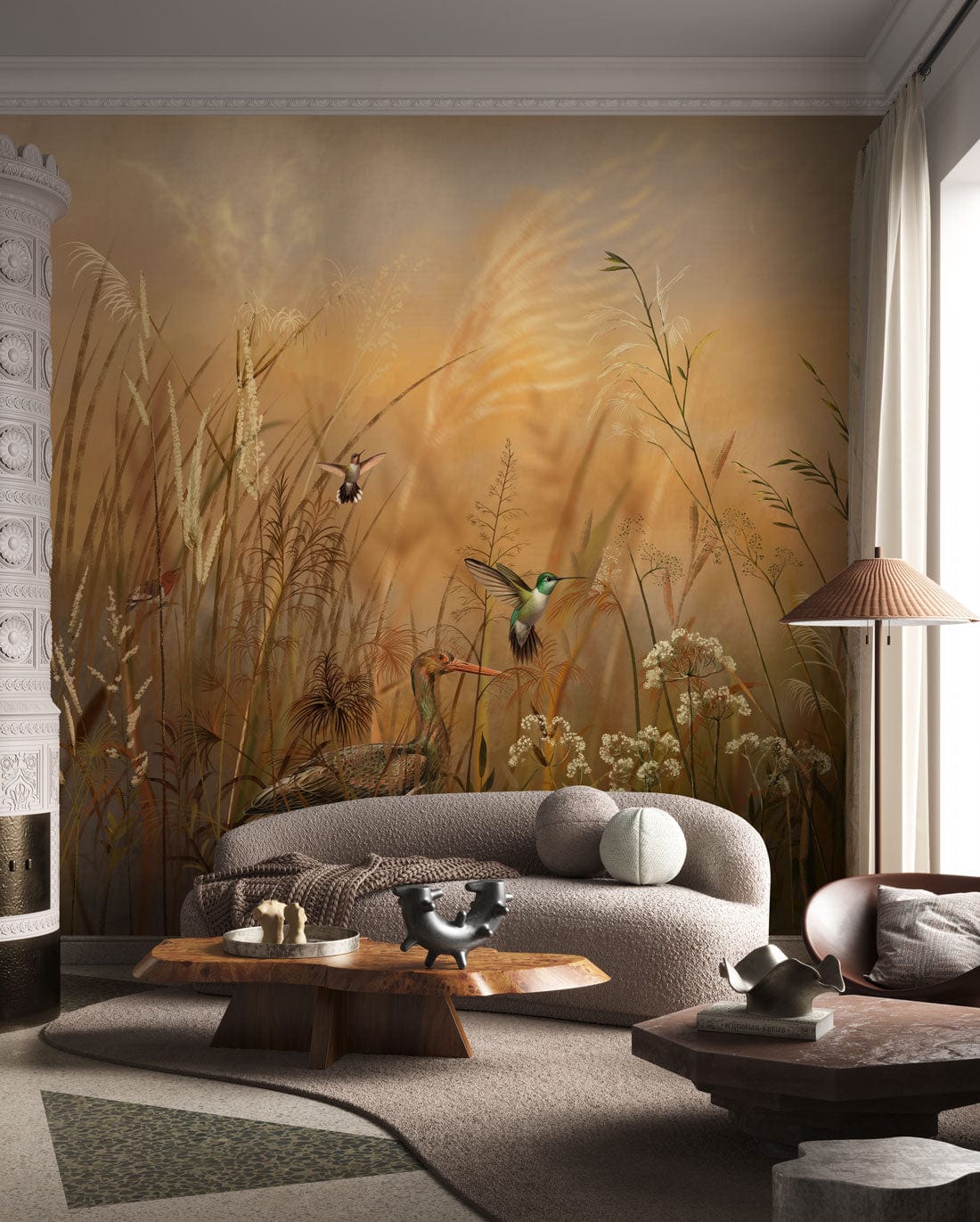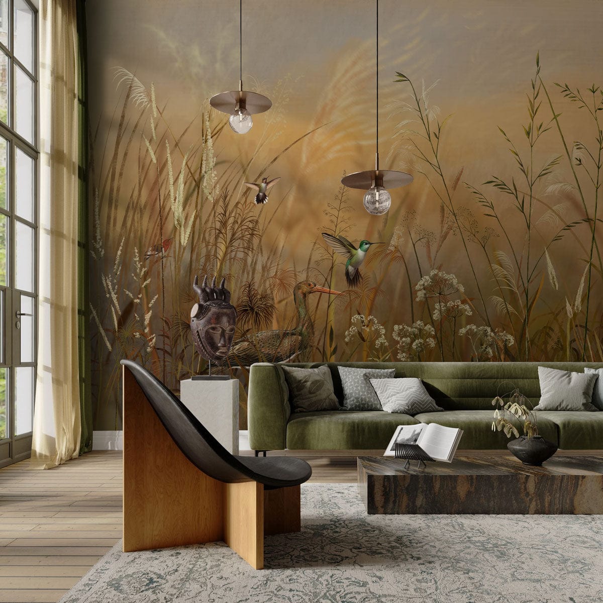 Immerse your space in the serene elegance of the Wild Meadow Serenity Mural Wallpaper, where meticulously detailed grasses sway amidst a delicate dance of birds. Its artistry captures the ethereal beauty of a meadow bathed in soft morning light. This sophisticated piece infuses interiors with a timeless charm, making an exquisite backdrop for both contemporary and rustic settings.