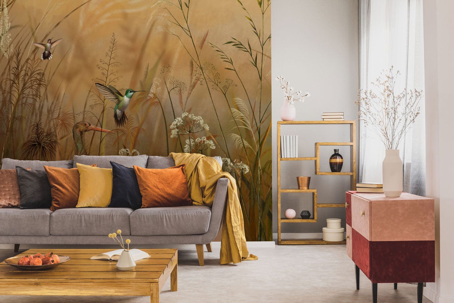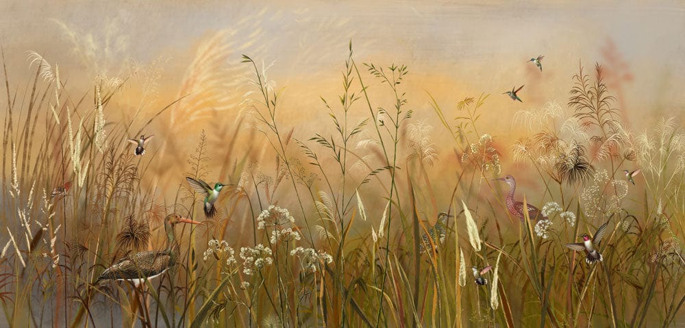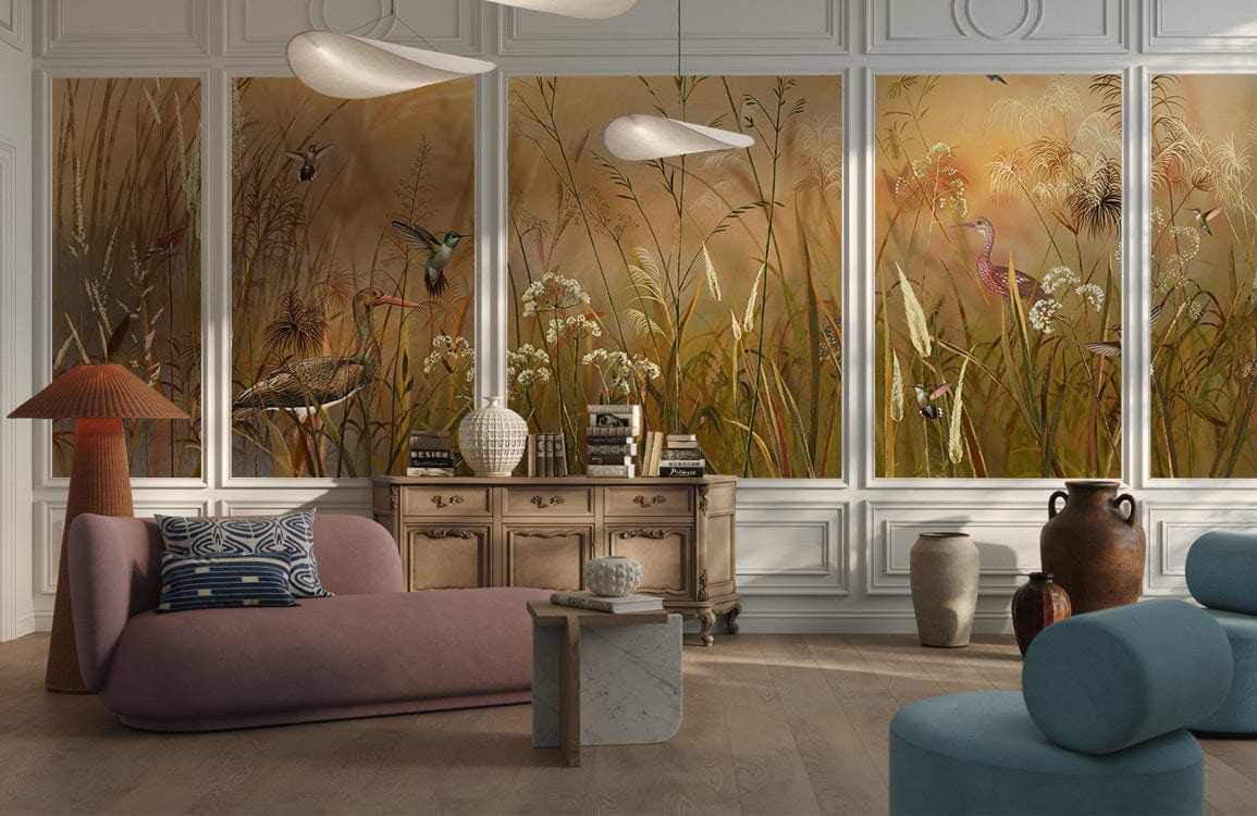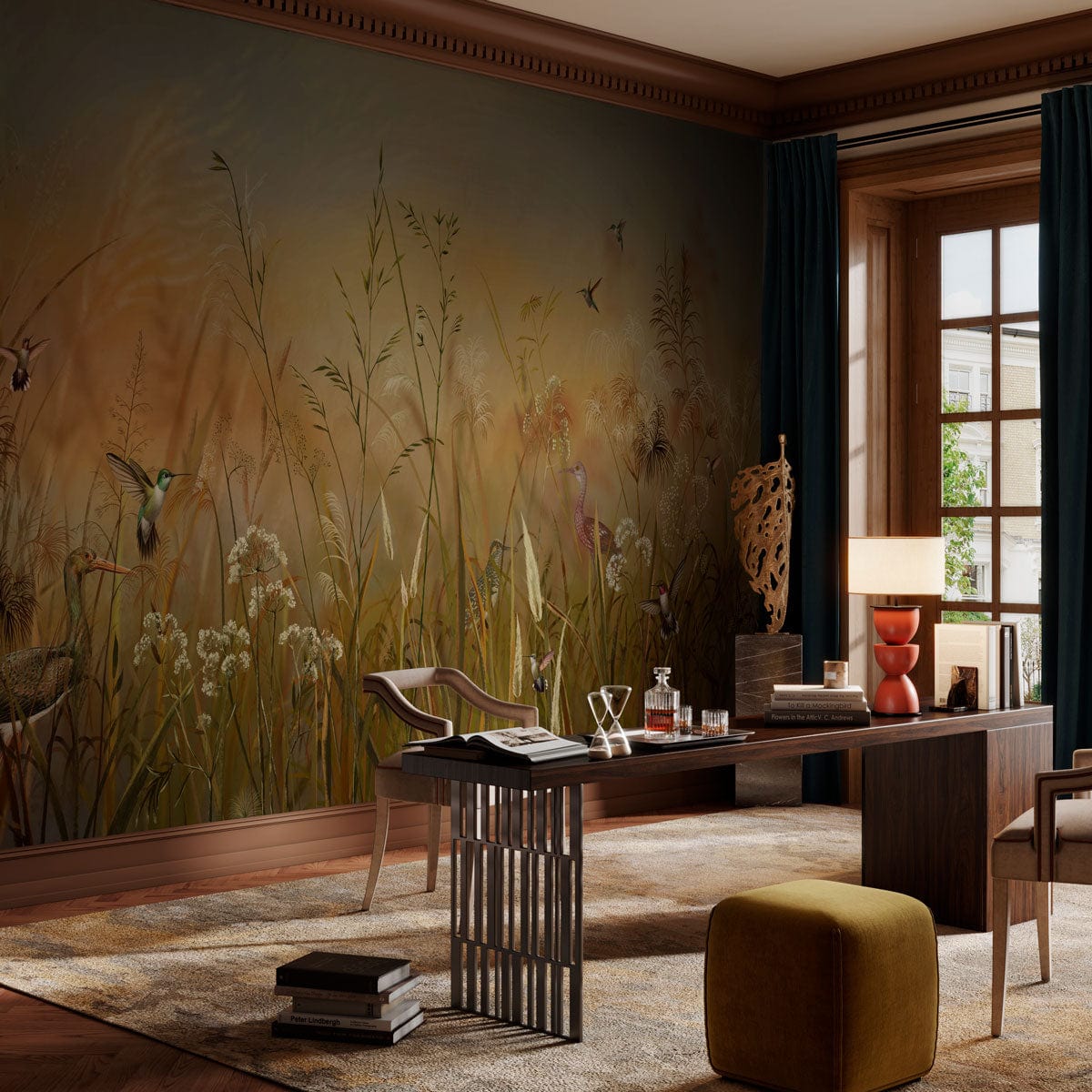 Immerse your space in the serene elegance of the Wild Meadow Serenity Mural Wallpaper, where meticulously detailed grasses sway amidst a delicate dance of birds. Its artistry captures the ethereal beauty of a meadow bathed in soft morning light. This sophisticated piece infuses interiors with a timeless charm, making an exquisite backdrop for both contemporary and rustic settings.