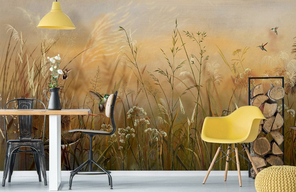 Immerse your space in the serene elegance of the Wild Meadow Serenity Mural Wallpaper, where meticulously detailed grasses sway amidst a delicate dance of birds. Its artistry captures the ethereal beauty of a meadow bathed in soft morning light. This sophisticated piece infuses interiors with a timeless charm, making an exquisite backdrop for both contemporary and rustic settings.