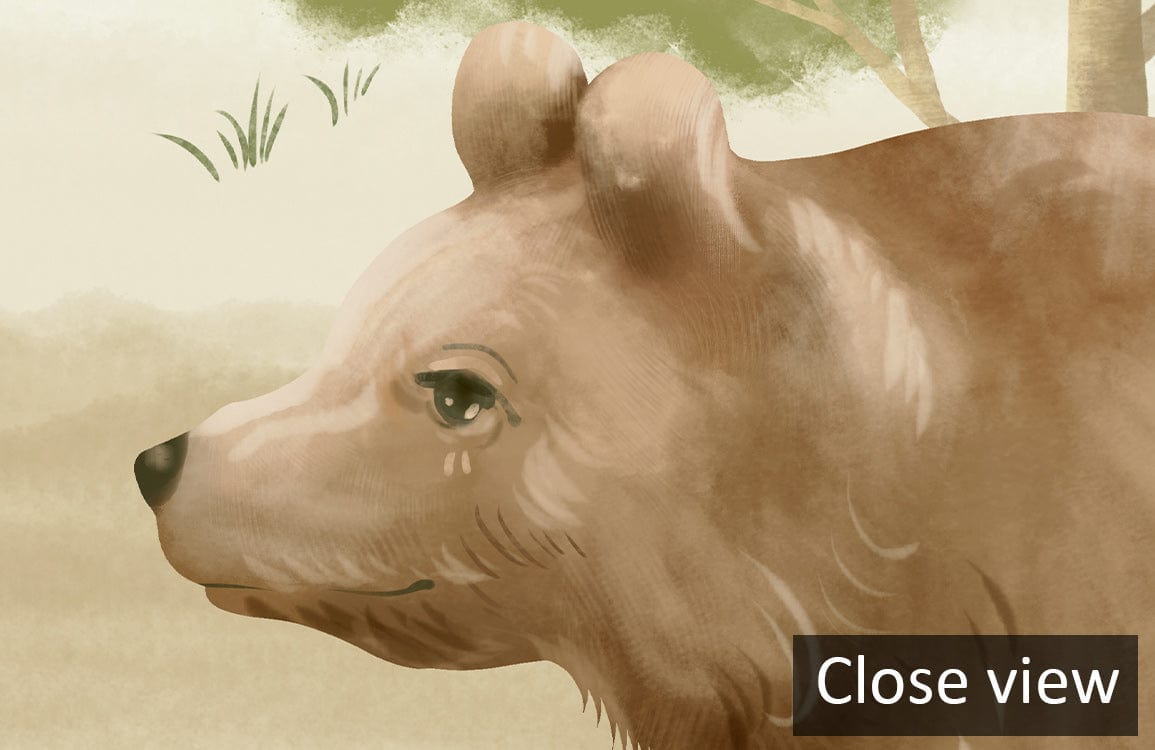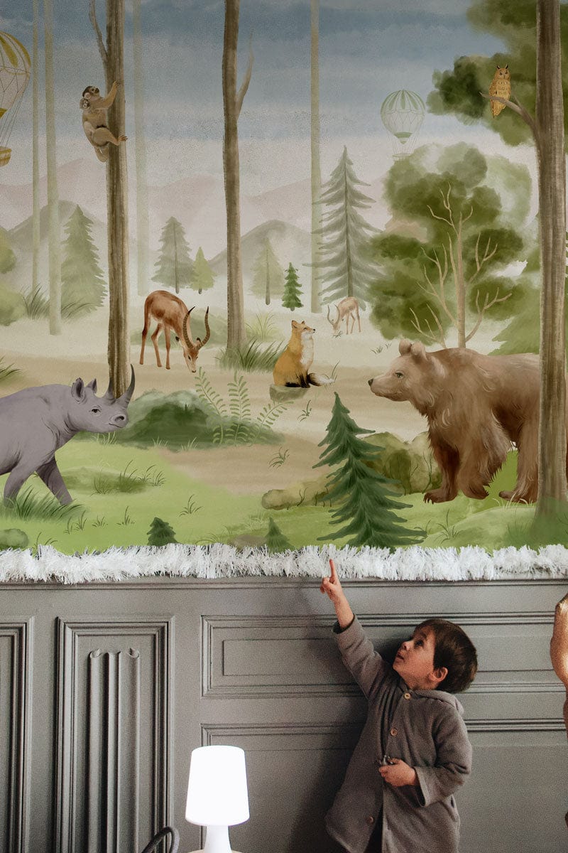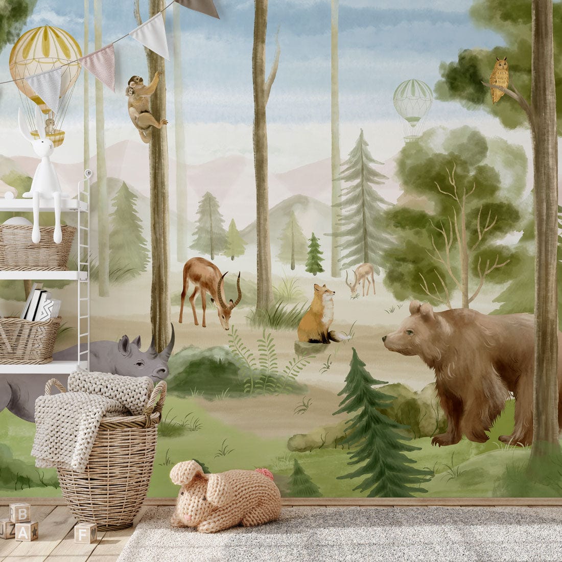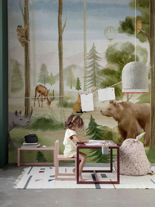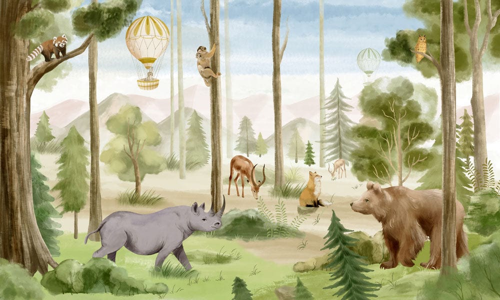 Immerse your space in the enchanting scenery of 'Wildlife in Dry Woods' wallpaper mural. This design features a serene forest landscape where diverse wildlife, from majestic bears to graceful deer, coexist amidst towering trees and soft mountains in the distance. The artistic blend of natural elements creates a harmonious setting, perfect for evoking a sense of calm and wonder in any room.