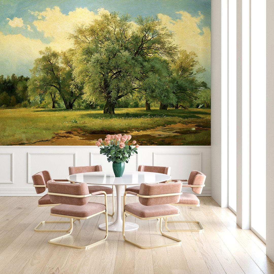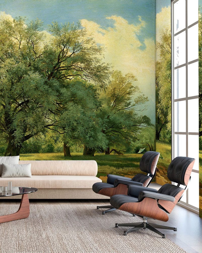 The Willows Lit Up by the Sun Wallpaper Mural captures a serene landscape where wispy branches are graced by soft sunlight. It brings a gentle yet striking tranquillity to any room, lending a graceful touch of nature indoors. The artistic depiction of lush trees and vibrant skies sets a sophisticated backdrop that adapts beautifully to both modern and traditional décor.