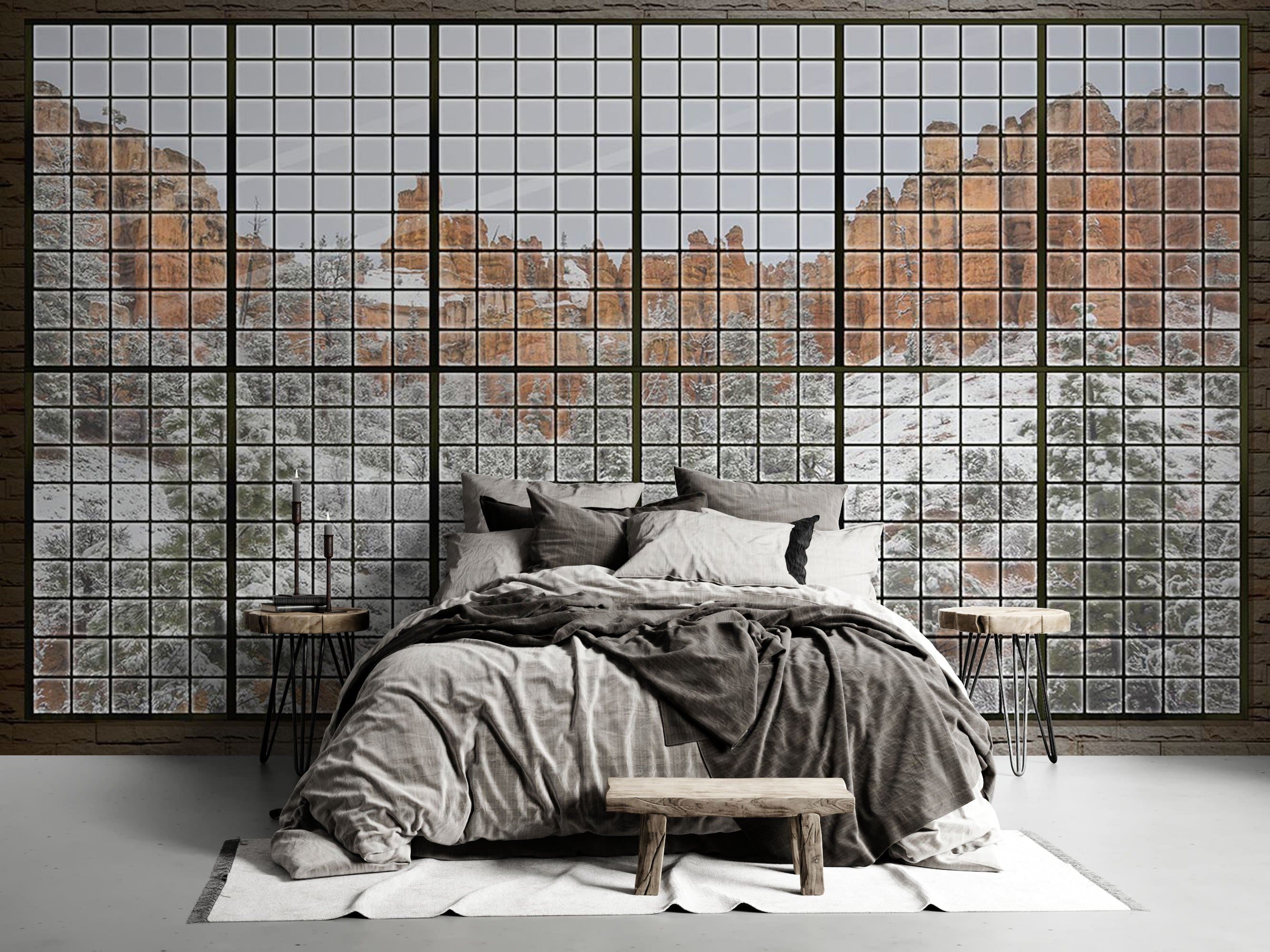 Look through the window and enjoy the beautiful snow scenery with this winter landscape of snowy mountains view through wallpaper mural. Add a peaceful touch and extend your room space with white snow mountain. Perfect wallpaper to bring nature close to your bedroom and living room.