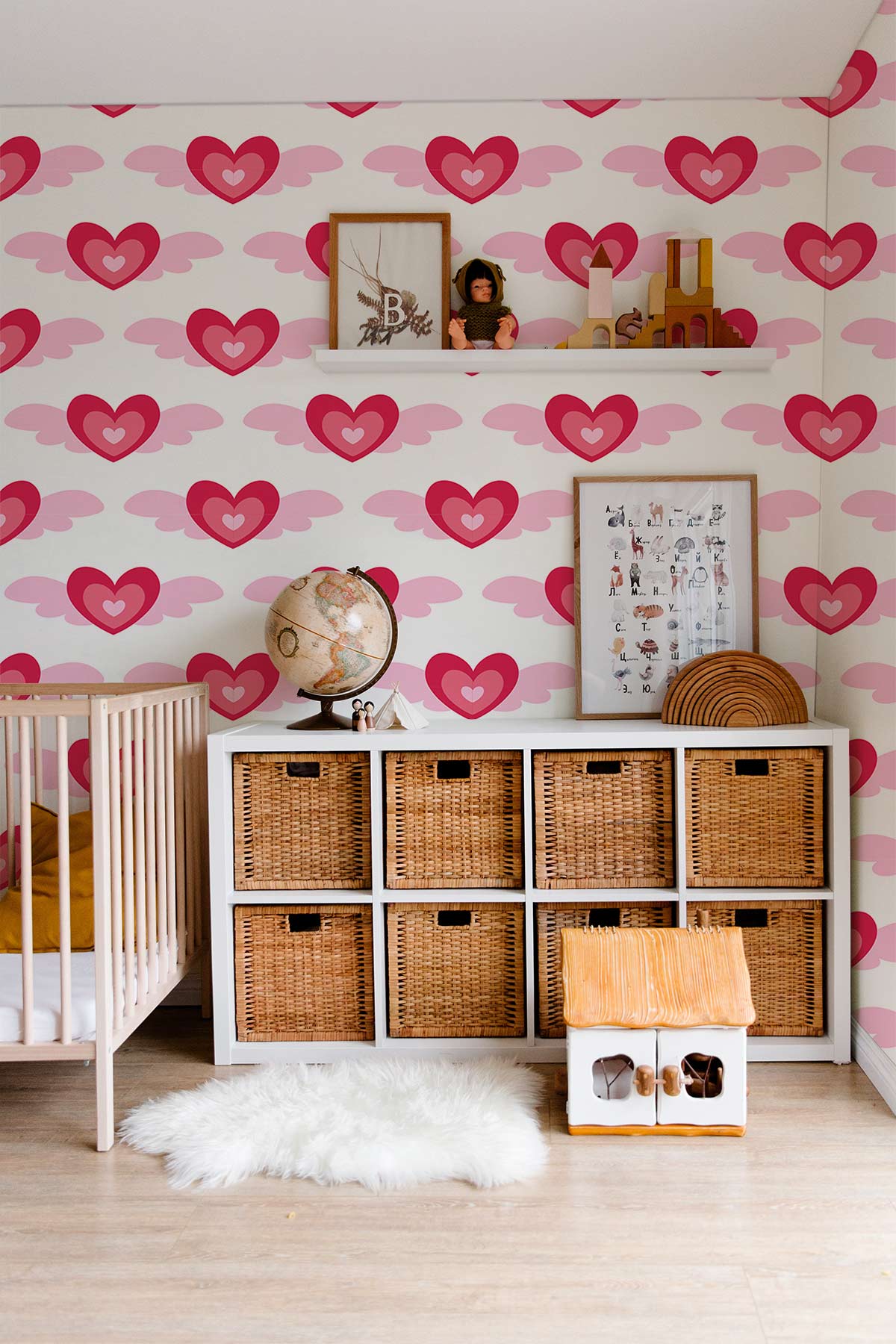 Bring love and softness to any wall with our Wings Love Wallpaper Mural. It features a beautiful mural of hearts with playful wings. The design is completed with swirls and lace-like patterns that give it a feminine touch. This mural will create a touch of love in your home and is certain to lift the mood in any room. Easy to hang, the application is simple and mess-free since there's no need to paste the wallpaper - simply use the pre-pasted strips!