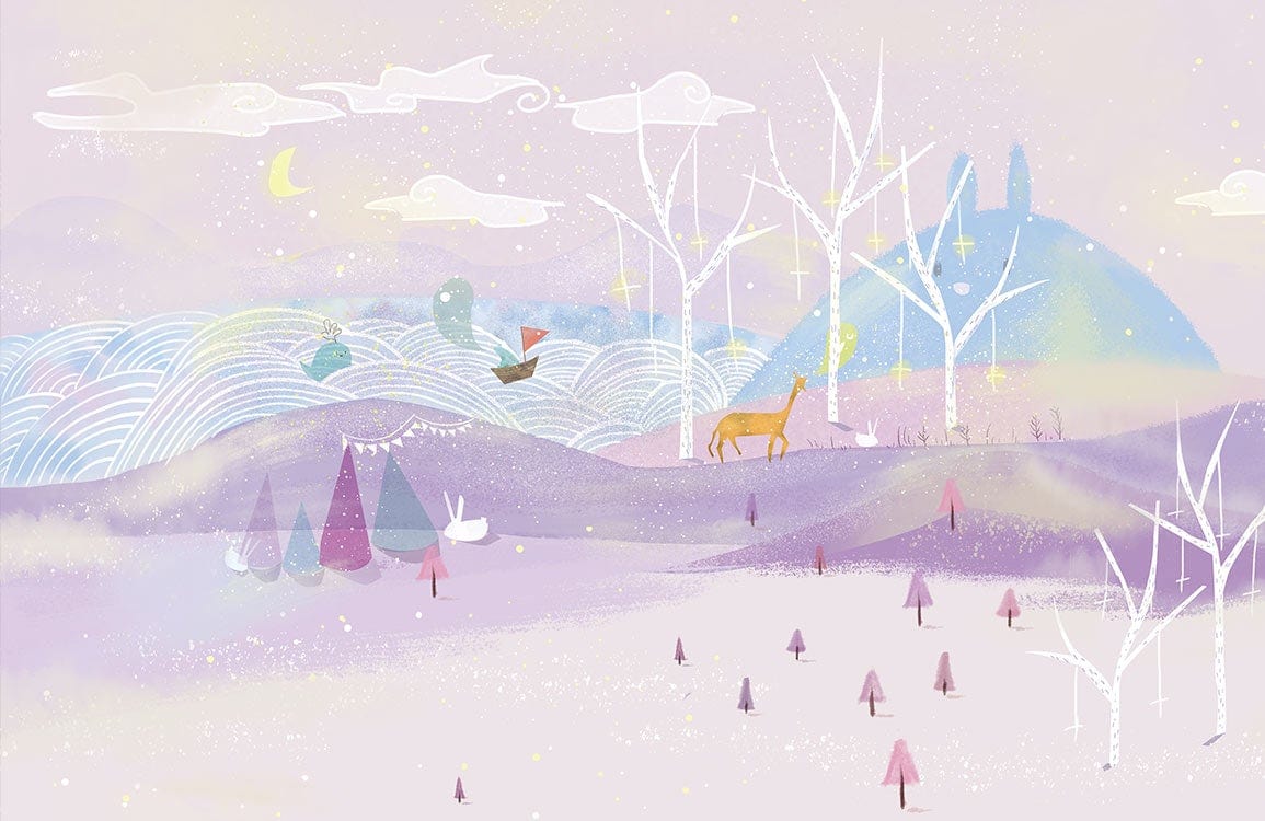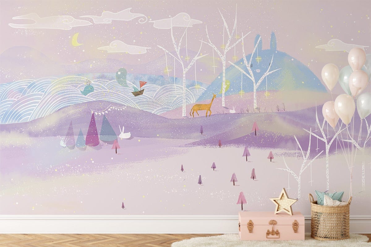 Have a wonderful start of the year and a different winter mood with this pastel lilac winter wallpaper mural. a fantasy land with tress and colourful objects all over the places to give a dreamy view for the design. This design is so simple and lite for your kids鈥?room, and also it is so perfect for a nursery the stars playing in the sky and the golden deer wandering in the dreamy land makes the room look so chic and so catchy for your child and eye relaxing. Make sure you style up with bright and lite decorations for a flowy looking at your place.