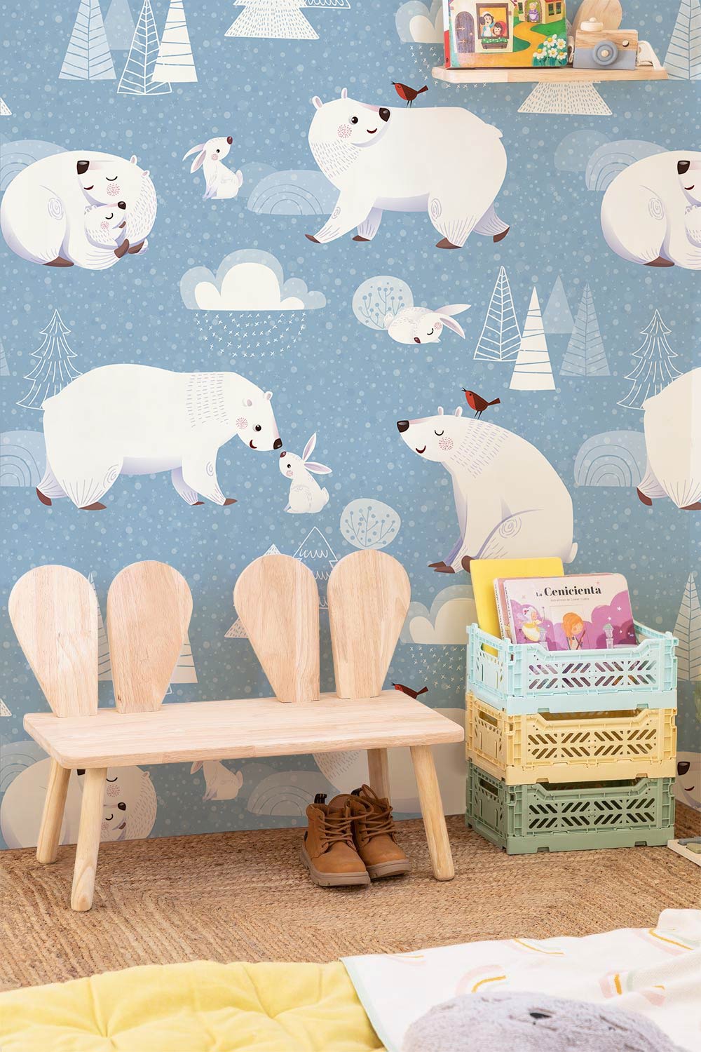 Upgrade the level of modernity and chic with this lovely light blue mural of polar white bears. These flawless white bears will increase the level of love in your heart by their kind cute moves. Our polar bears are friends with birds, rabbits and they are good parents as well taking care of their babies. Winter is cold and freezing but these bears will melt your heart and add warmness to your place with the love in this wallpaper. You can add the wallpaper in your children鈥檚 room. your nursery or your bathroom. You can also add it in kids playing area and encourage your child to get to know the different kind of animals and how they can still be kind and play with each other.