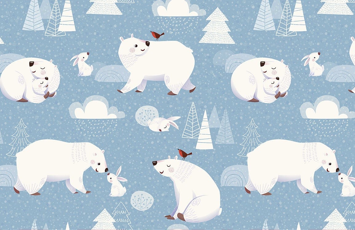 Immerse yourself in a serene winter wonderland with this exquisite polar bear wallpaper mural. Impeccably detailed, it features charming polar bears, delicate rabbits, and intricate forest motifs, all set against a gentle, snowy backdrop. The wisely chosen hues and artistic textures invite sophistication and tranquillity, making it an ideal fit for refined interiors.