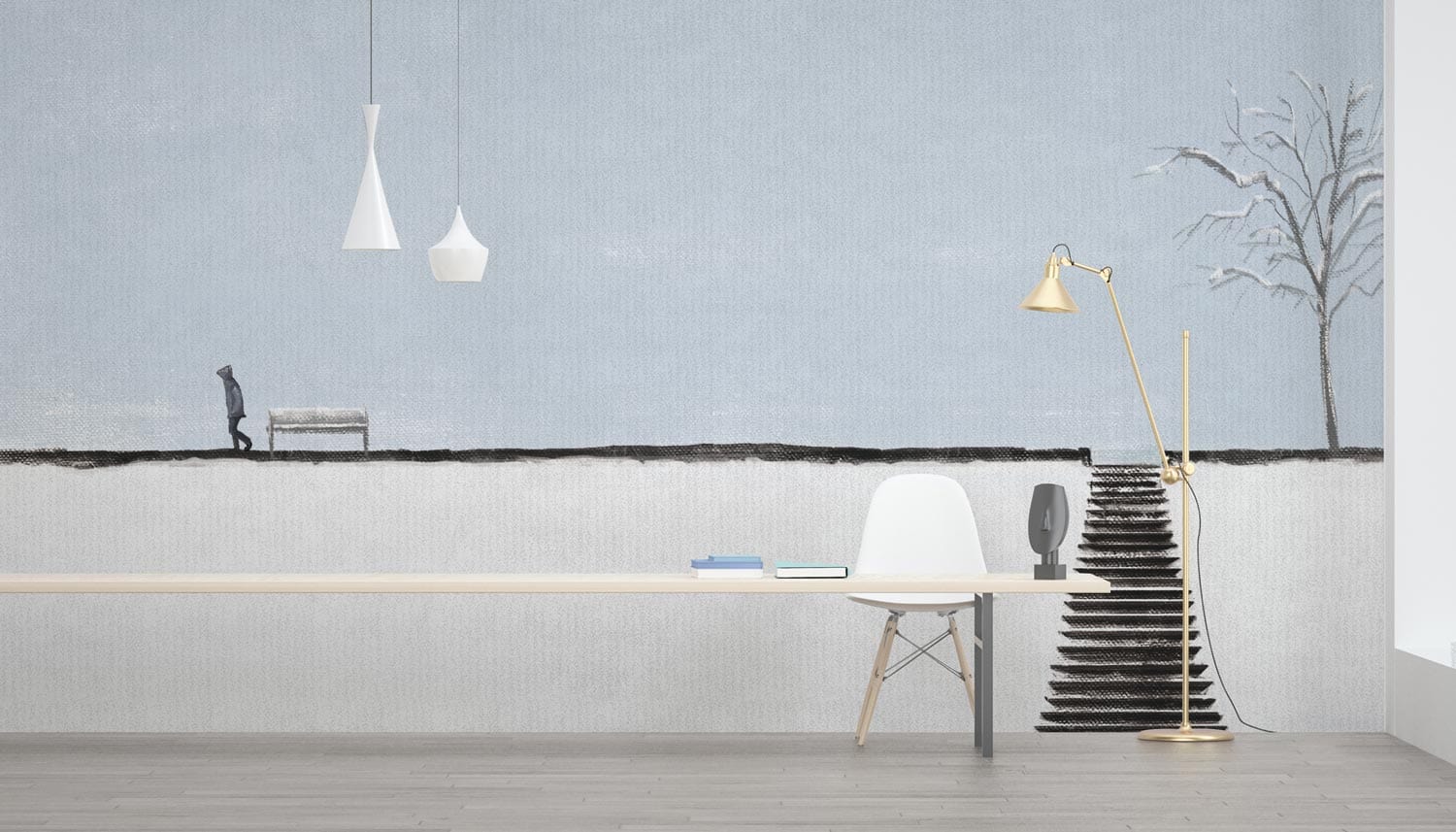 Immerse yourself in the serene allure of the Winter Road Wallpaper Mural. This exquisite design captures a minimalist winter landscape, featuring a lone tree silhouetted against a soft blue sky, alongside a gently winding path that invites introspection. Its subtle textures evoke a sense of tranquillity, making it an ideal focal point in spaces where elegance and peace are desired.