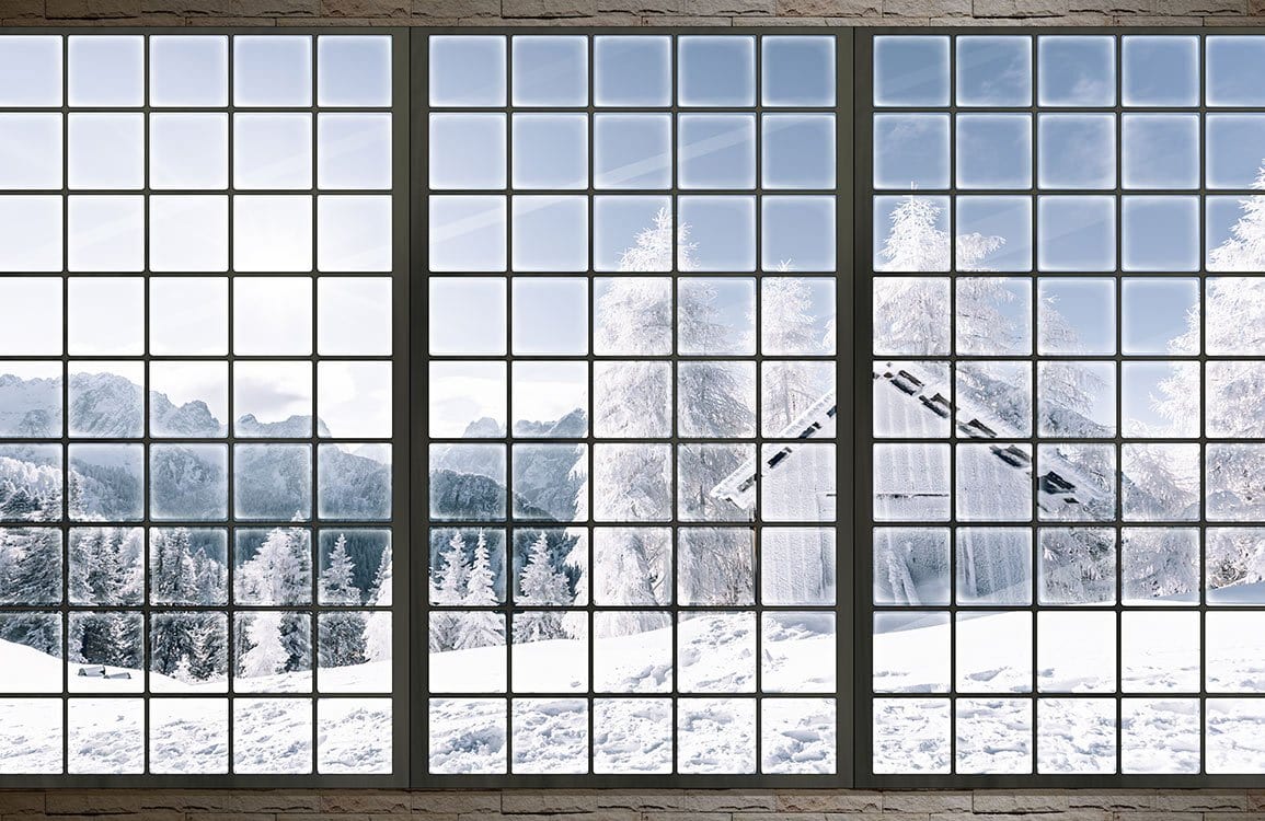 Experience a serene winter panorama with the Window Snow View Wallpaper Mural, where a delicately frosted landscape is framed by elegant grid-like panes. This mural captures the stark beauty of snowy pines and a quaint cottage, inviting tranquillity and sophistication into any space. Its timeless design effortlessly complements both traditional and contemporary interior styles, providing a unique and serene focal point.