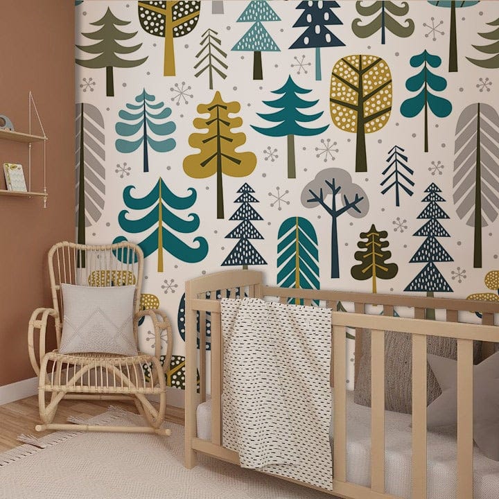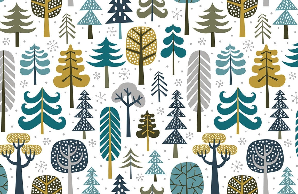 Immerse yourself in the tranquil charm of a winter woodland with this exquisite wallpaper mural. Adorned with stylised trees, each bearing delicate geometric patterns against a crisp white backdrop, it captures the serene allure of nature's quiet season. The refined palette of muted greens, subdued yellows, and soft blues creates a soothing ambience, effortlessly complementing a variety of interior aesthetics, from modern to eclectic styles.