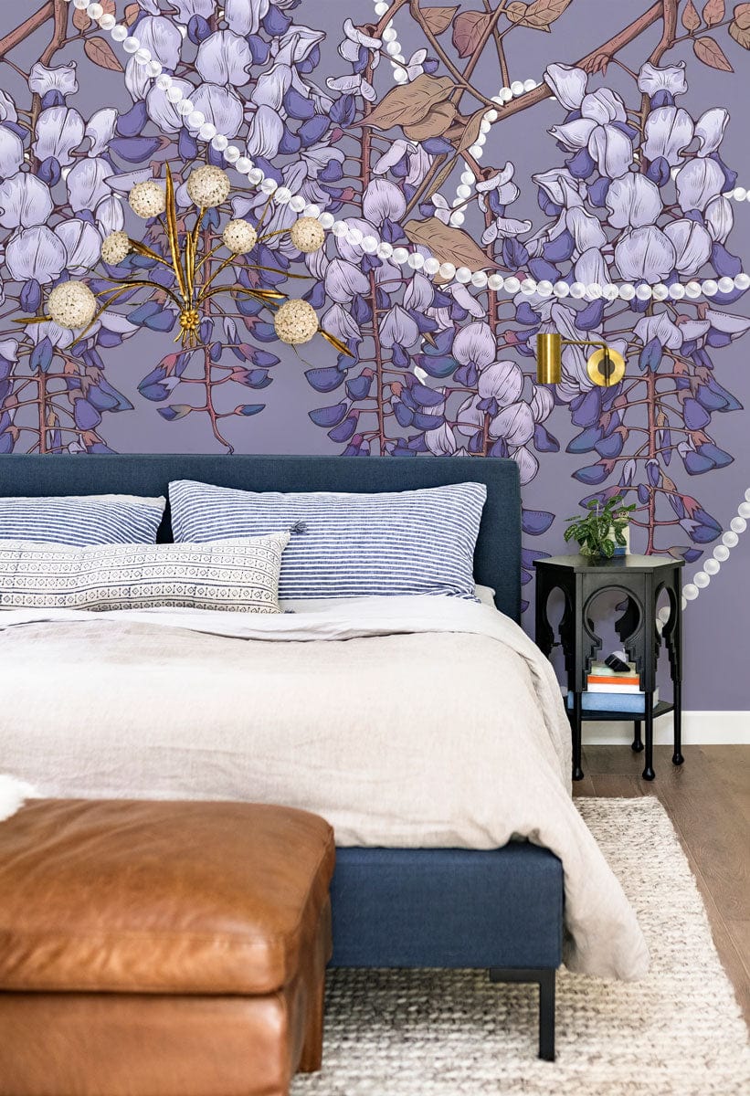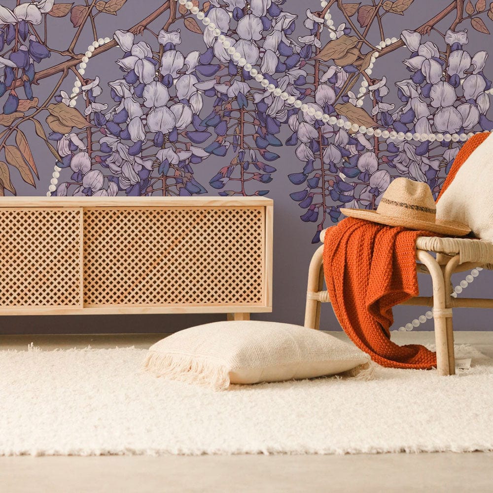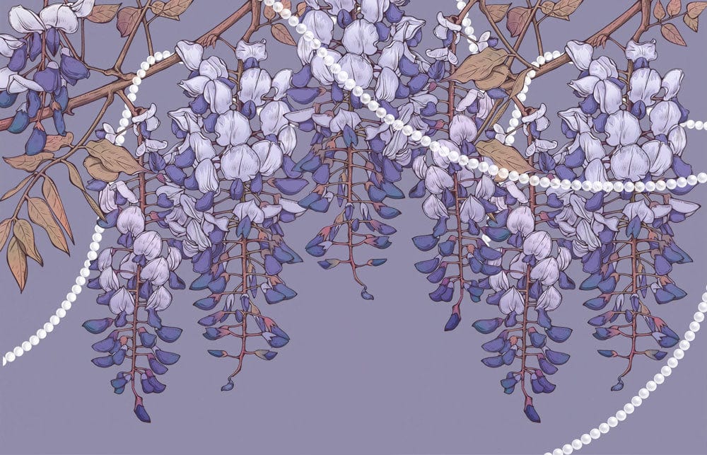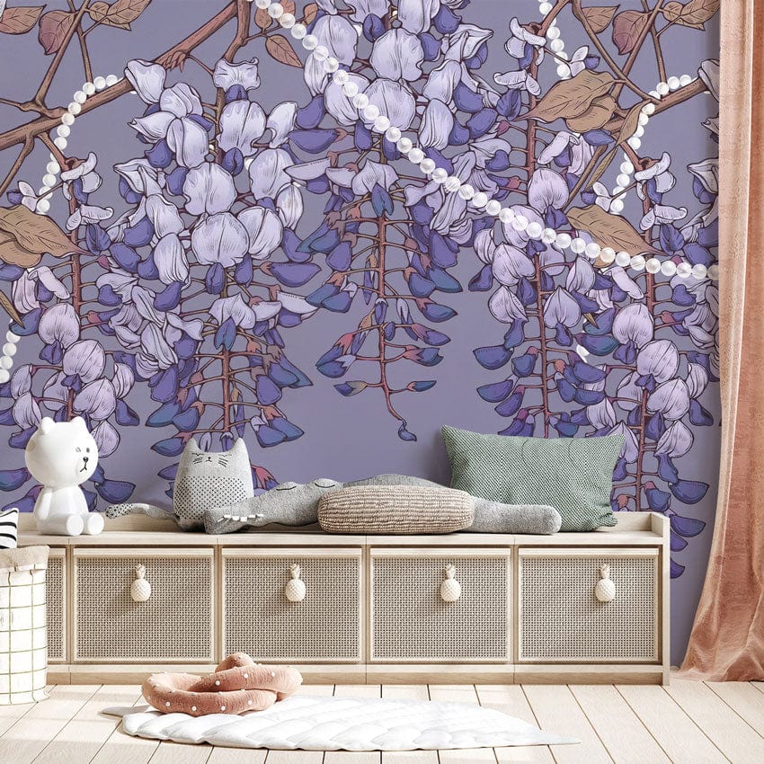 This elegant Wisteria Flower Wallpaper Mural captures the lush, cascading beauty of purple wisterias, set against a gentle, muted grey backdrop. Delicate pearl-like strands weave through the design, adding a touch of sophistication. Ideal for both classic and contemporary interiors, this mural brings a serene and timeless nature-inspired ambience to any space.