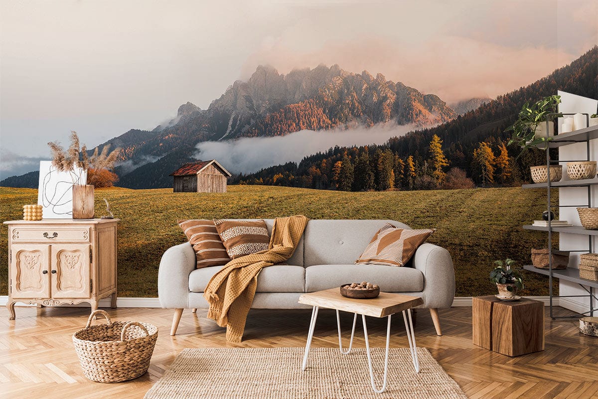 This Wooden Cabin Wallpaper Mural depicts a serene landscape, where a solitary cabin rests amidst lush greenery with a majestic mountain backdrop. The gentle hues of autumn paint the scene with a soothing palette, inviting tranquillity and a sense of escape into any room. Perfectly suited for creating a retreat-like ambience, this mural captures the tranquil beauty of nature with artistic precision and an inviting texture.