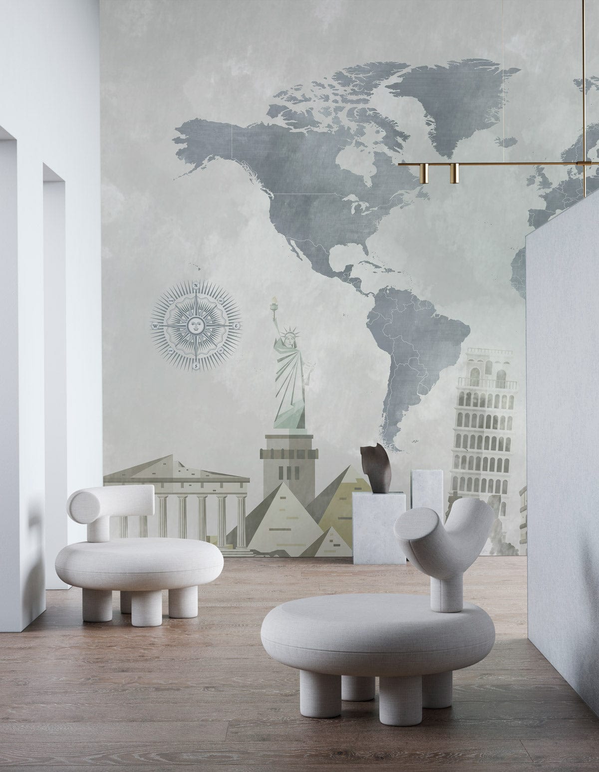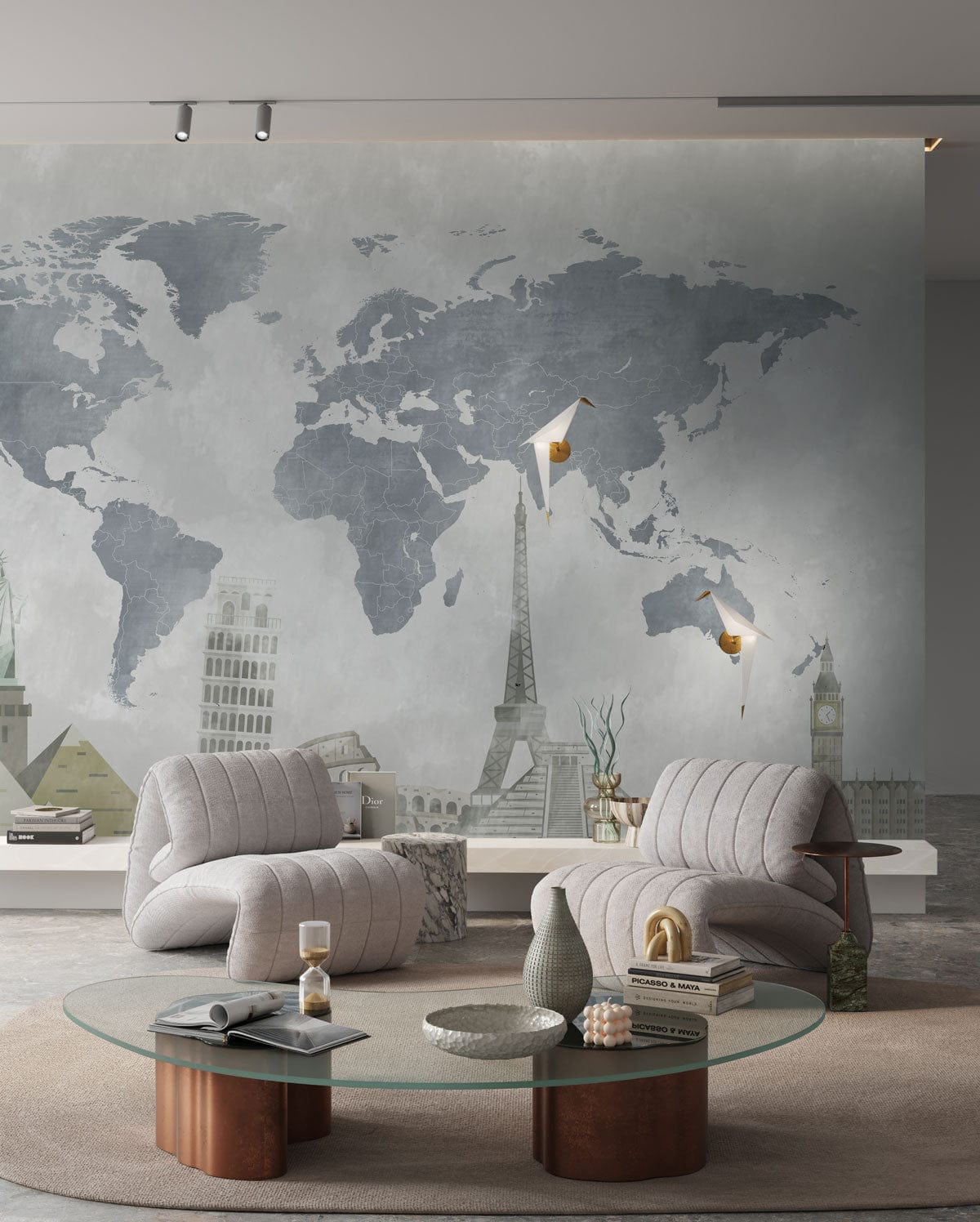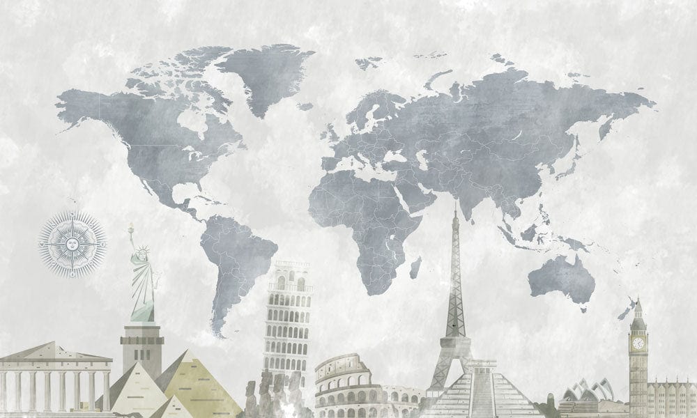 World Landmarks Grey Abstract Map Mural Wallpepr