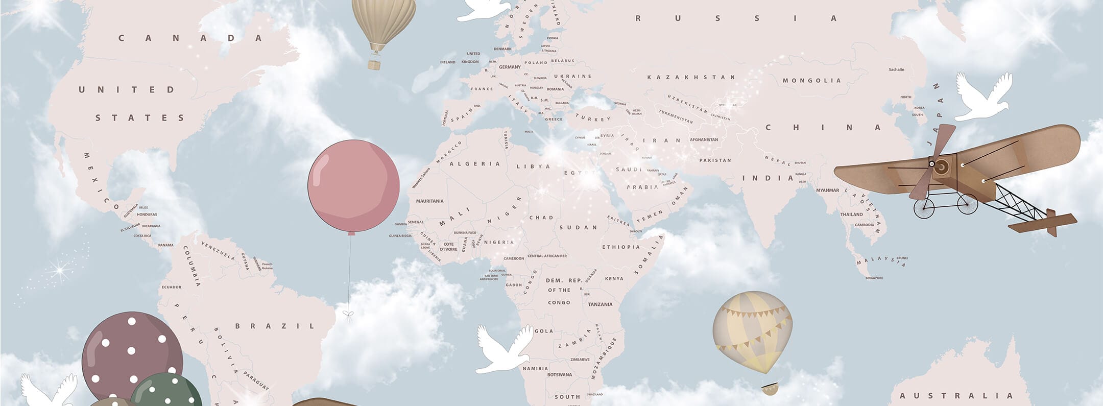 Immerse yourself in the serene elegance of this World Map Wallpaper Mural, where soft pastel tones merge with playful vintage motifs. Detailed geographical depictions float amidst clouds, punctuated by charming vintage aircraft and balloons, inviting both curiosity and repose. Perfect for sketched travel dreams or quiet moments, it effortlessly complements any interior with a seamless blend of whimsy and sophistication.