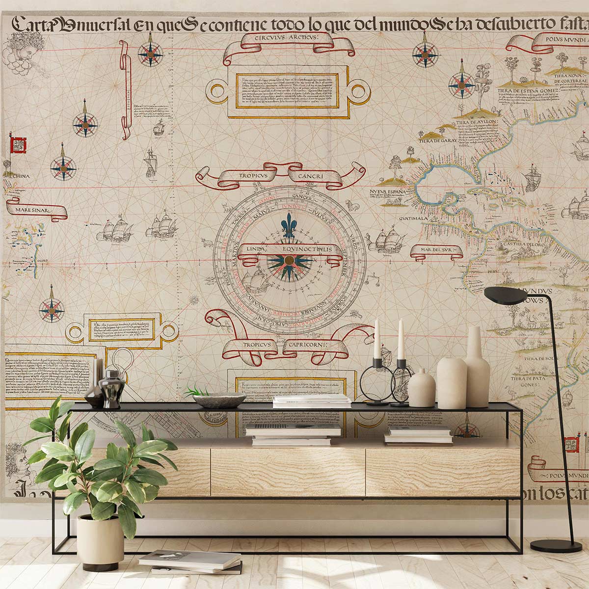Unveil a world of antiquity and charm with this World Map Wallpaper Mural. The intricate lines and detailed cartography echo a bygone era, inviting you on a journey through exploration and discovery. Subtle earth tones paired with delicate sea hues lend a calming quality to any room, while the ornate compass roses and vintage scrollwork add a touch of sophistication. Ideal for those with a penchant for history and elegance, this mural seamlessly integrates into both classic and contemporary interiors.