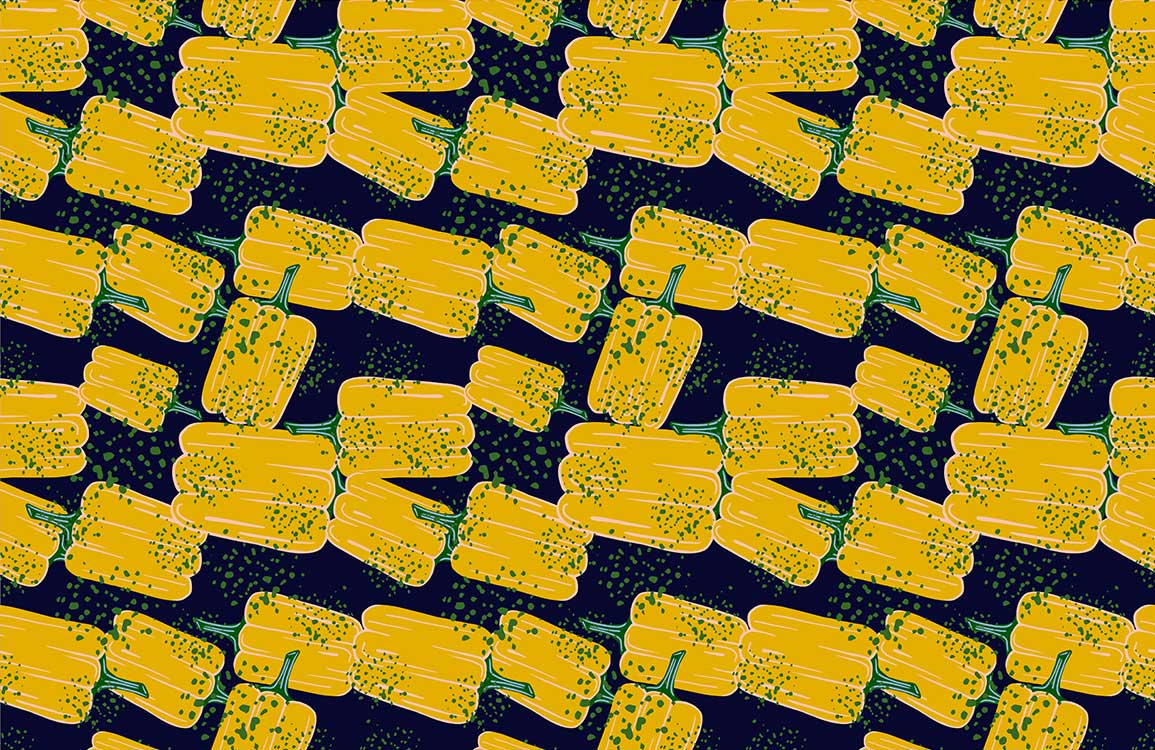 Introducing a captivating Yellow Bell Pepper Wallpaper Mural, blending vibrant ochre yellows with deep navy tones. Its exquisite pattern of intricately designed peppers offers a stunning contrast, infusing any space with freshness and sophistication. The artistic depiction blends contemporary charm with an organic touch, making it a versatile choice for lovers of eclectic and natural motifs.