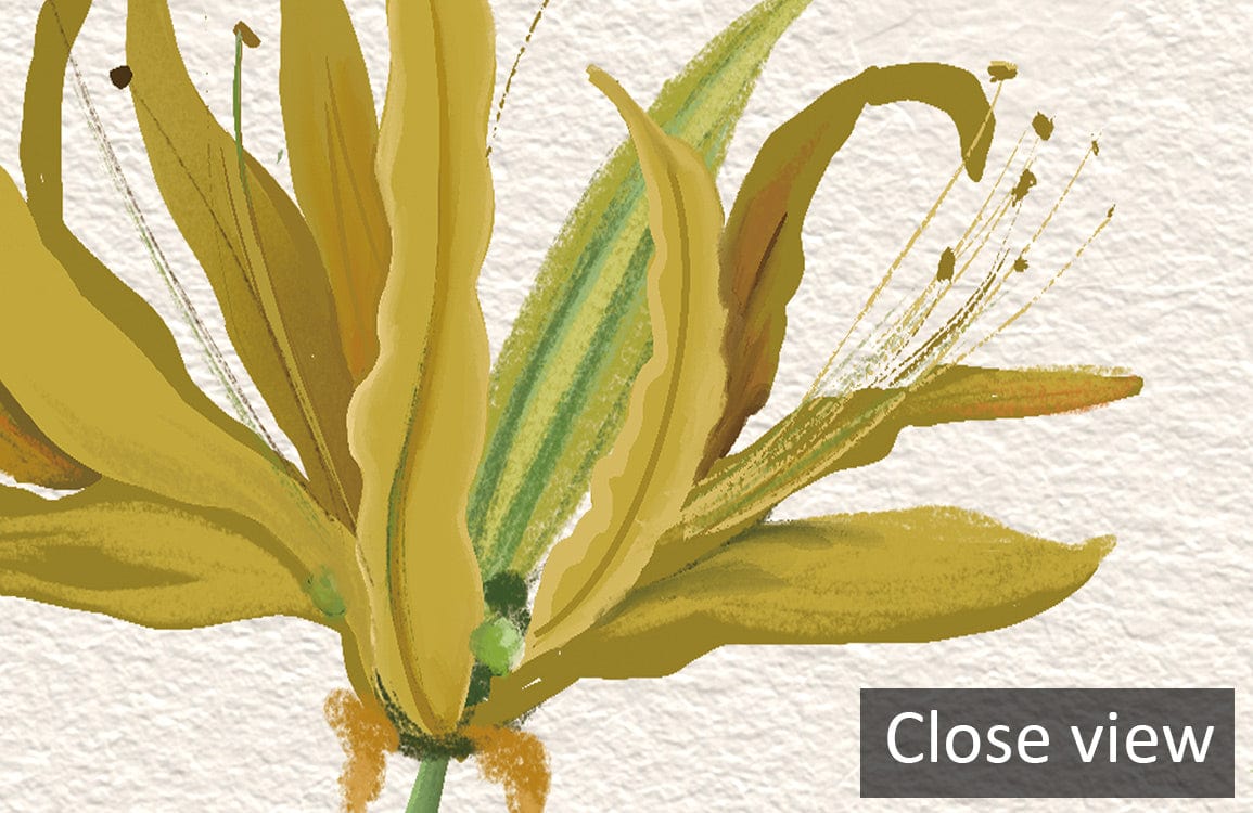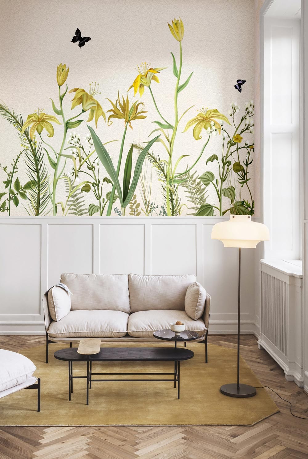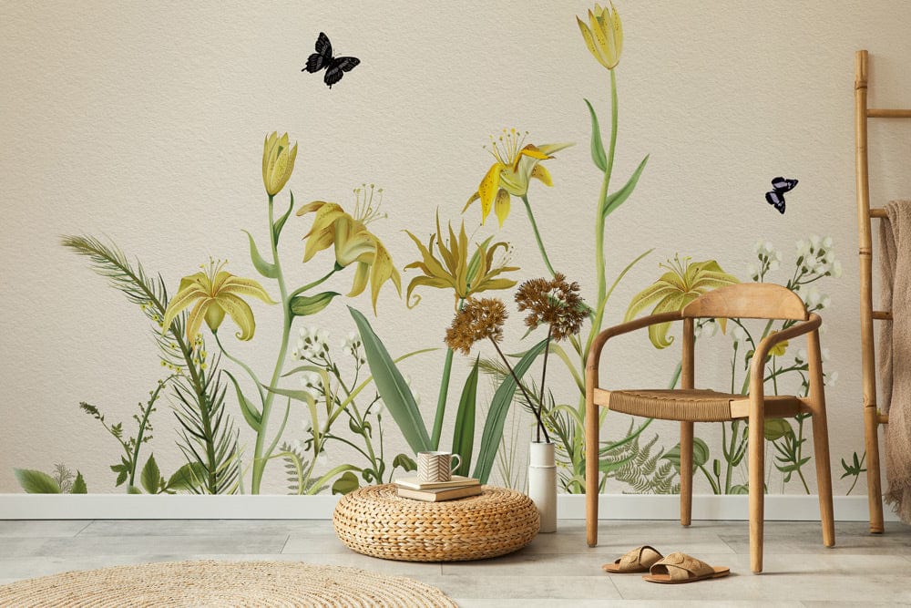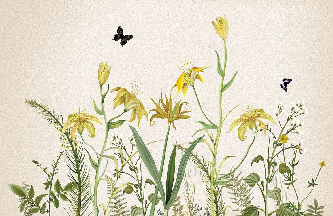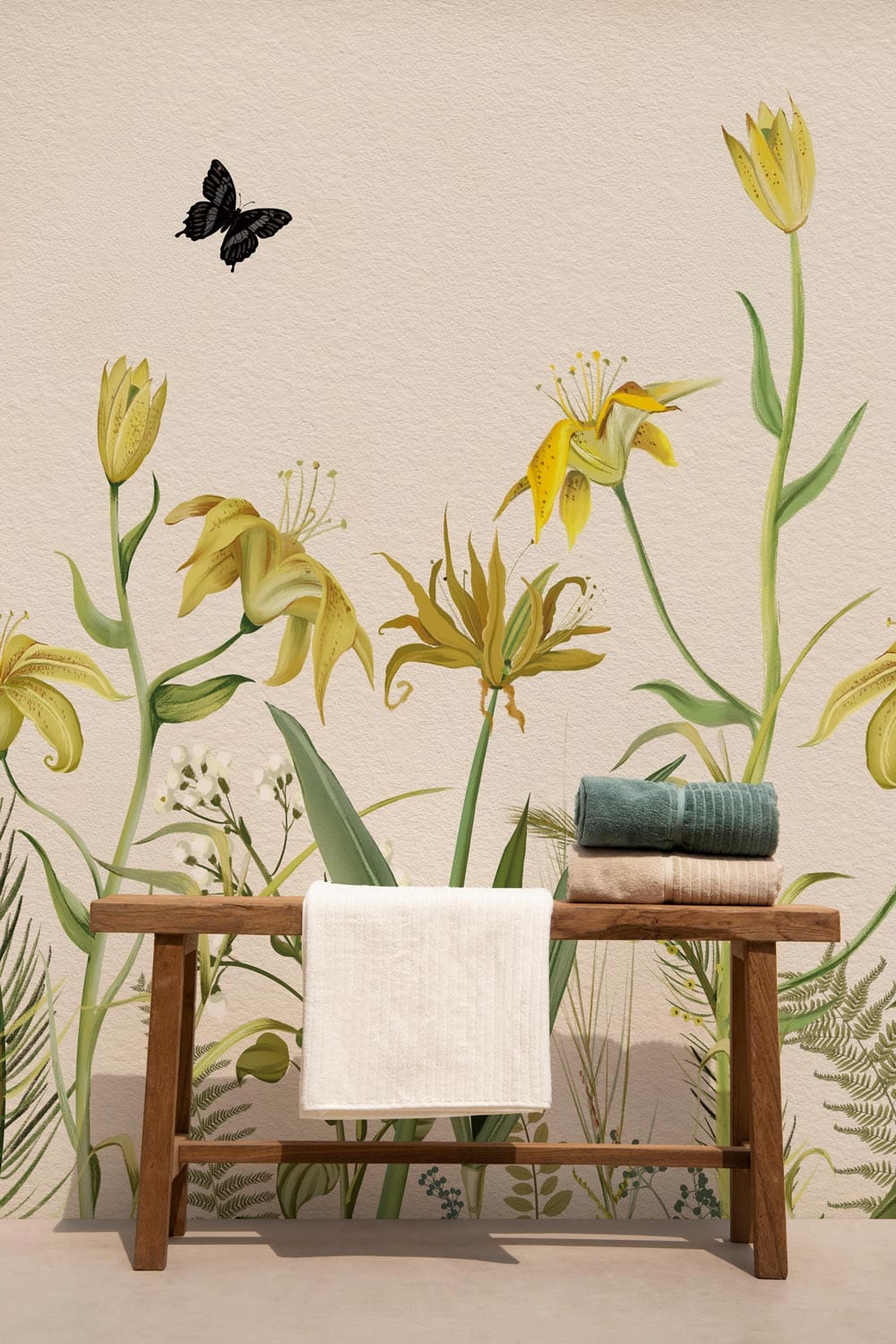 Immerse your space in the timeless elegance of nature with this Yellow Flower Bushes Wallpaper Mural. Delicate golden blooms intertwine gracefully with lush green stems against a subtle cream backdrop, capturing an essence of sophistication and serenity. This mural's intricate design and gentle hues create a tranquil atmosphere, making it a versatile choice for both classic and contemporary interiors.