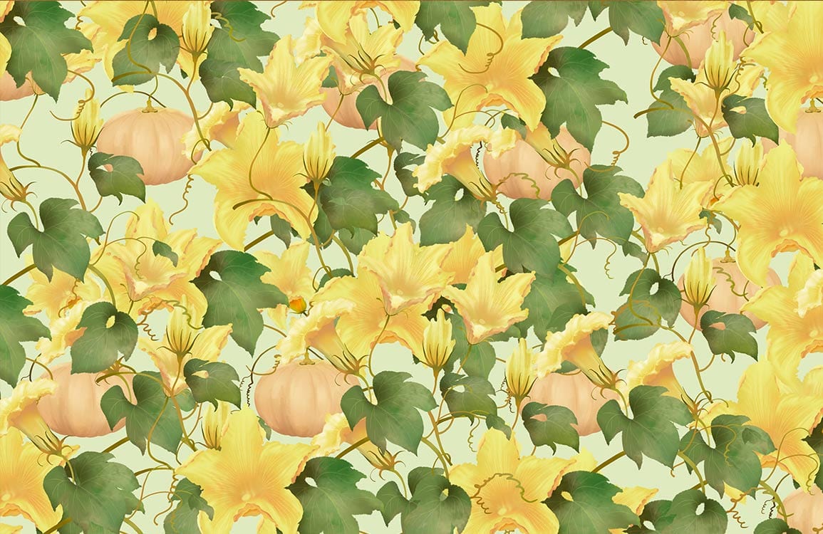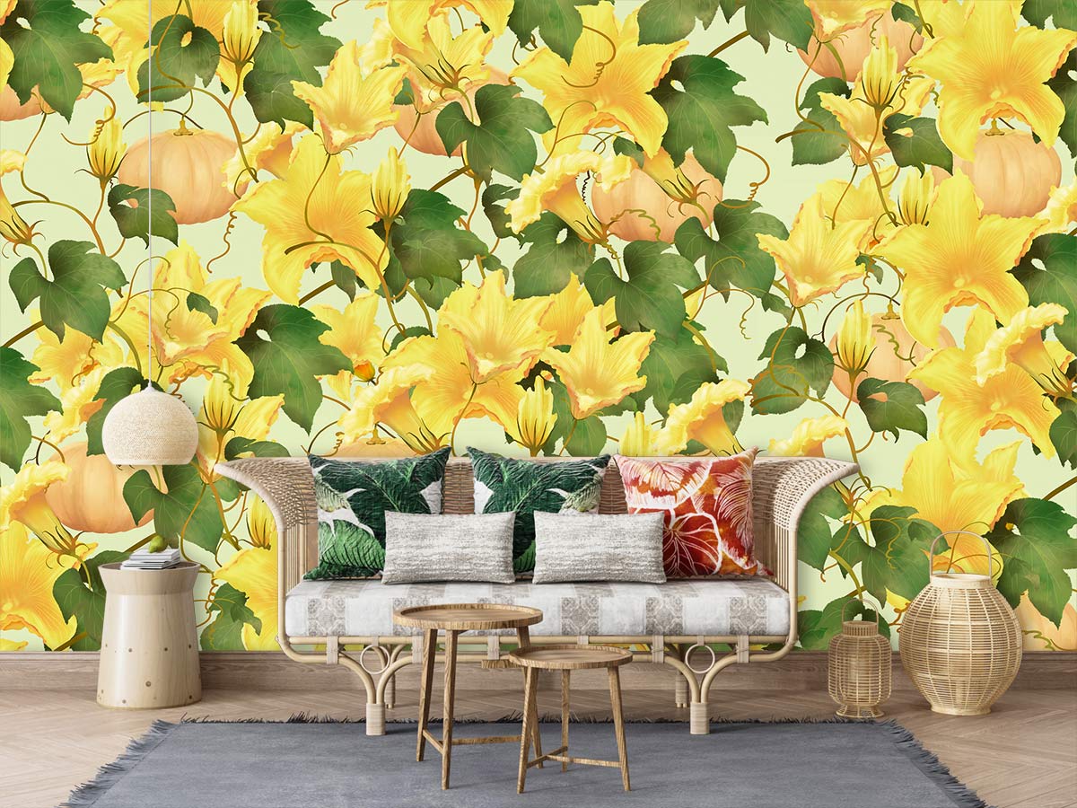 Immerse yourself in the timeless elegance of this Pumpkin & Flowers Wallpaper Mural, where the delicate intertwining of golden blossoms and rich green foliage creates a serene and inviting atmosphere. The design captures the essence of a lush autumn garden, adding a sophisticated charm to any space. Perfect for a feature wall, its intricate details and soft textures lend an effortlessly classic appeal to both contemporary and traditional interiors.