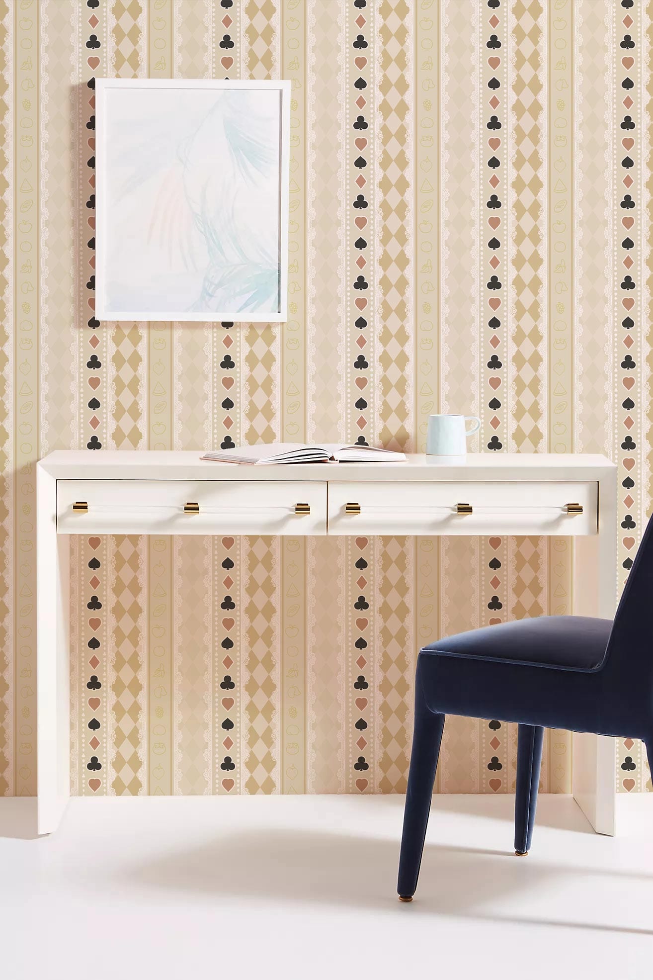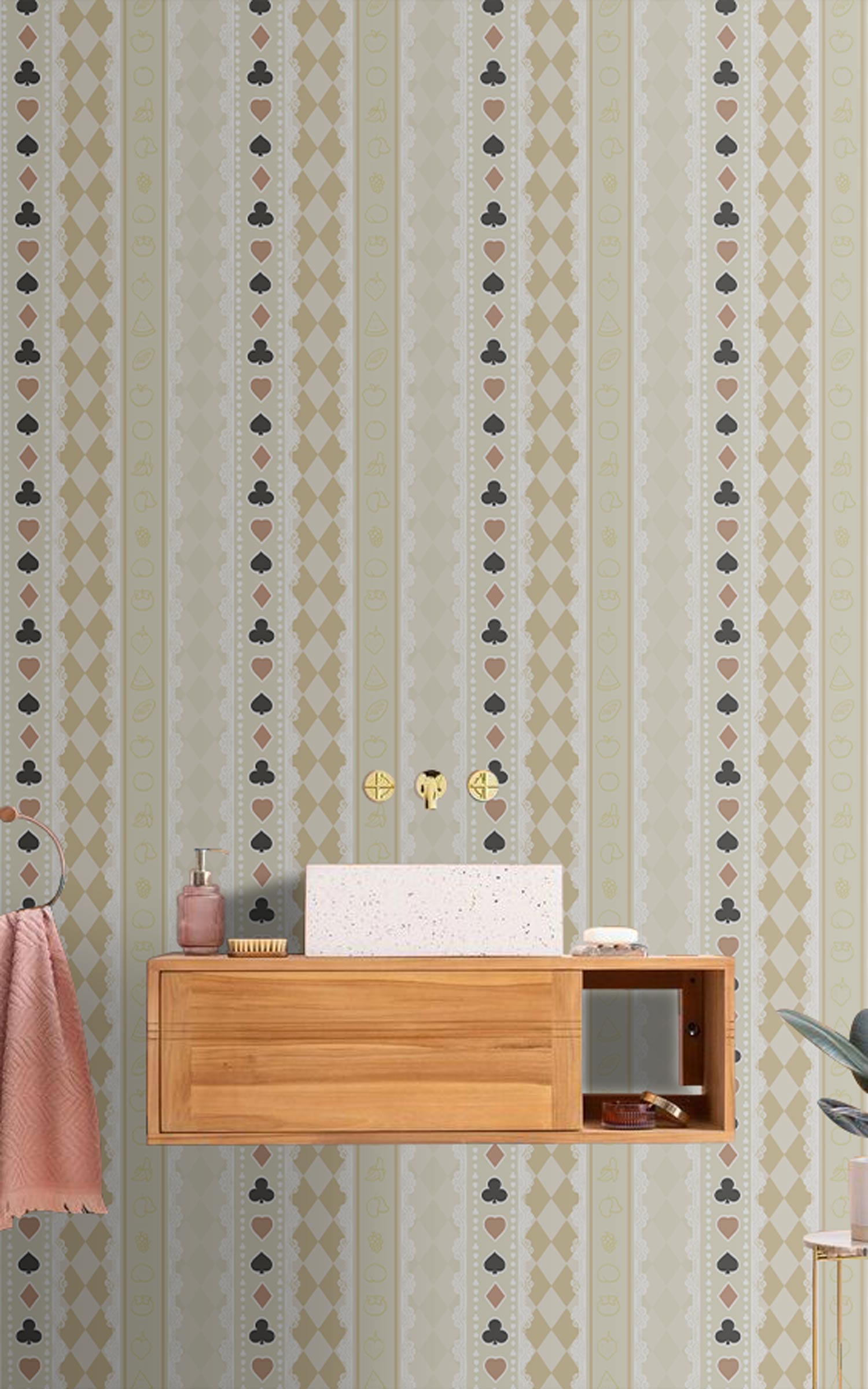 Spice up your walls with this beautiful wallpaper mural. Designed with vertical repeated patterns of cards, geometric and other small graphics in pastel tones, this wallpaper will surely add a touch of glamour to your interior space with simple grace. Perfect wallpaper mural to decorate your bedroom, living room, bathroom and dining room.