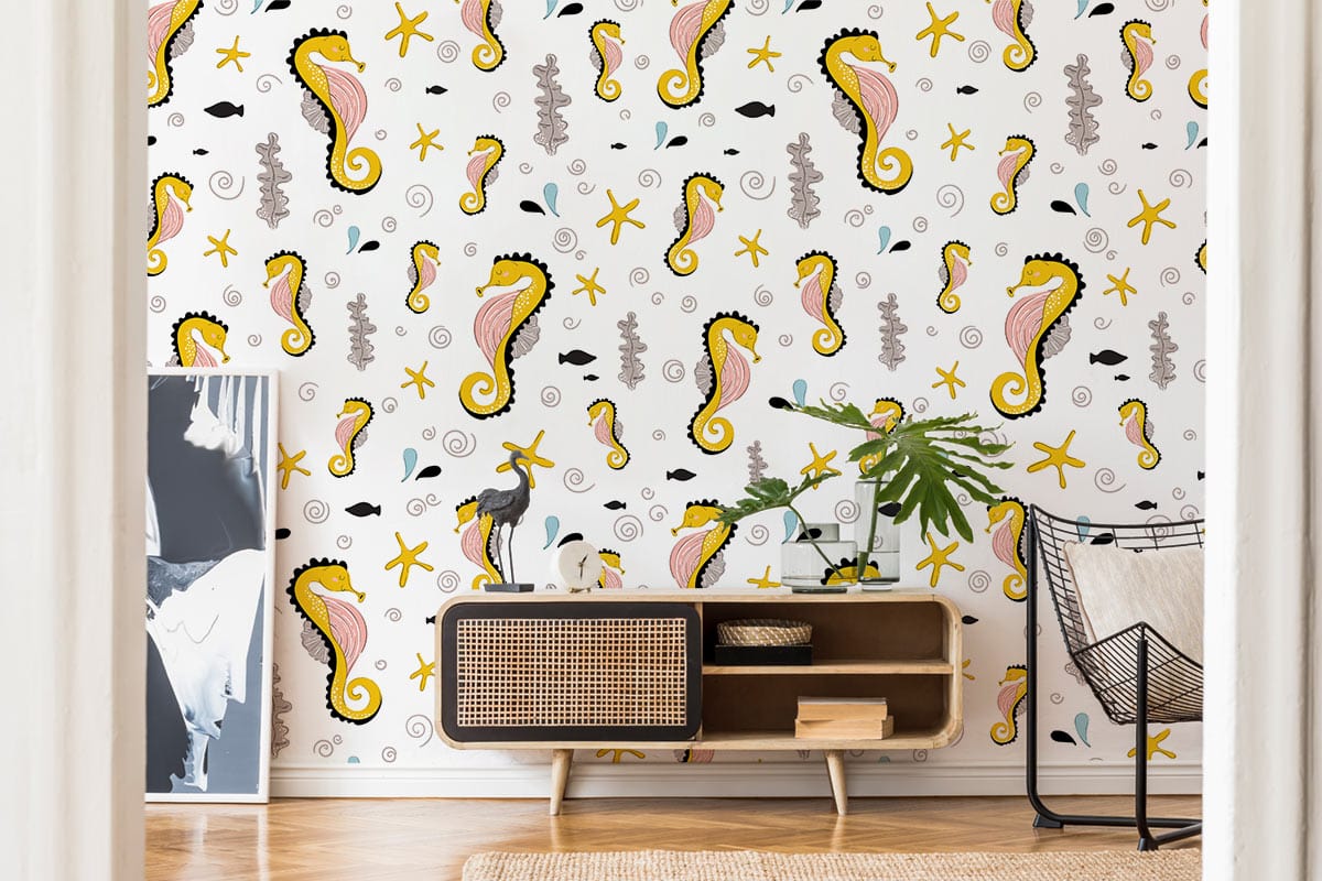 Immerse your space in the charm of the sea with the Seahorses & Starfishes Wallpaper Mural. Featuring elegant seahorses and whimsical starfish motifs, this mural captures the serene beauty of ocean life. Intricate details in bold yellow and soft pink against a pristine white background evoke a sense of playful sophistication. Perfect for creating a focal point in any room, this wallpaper's captivating design effortlessly complements both contemporary and classic interiors.