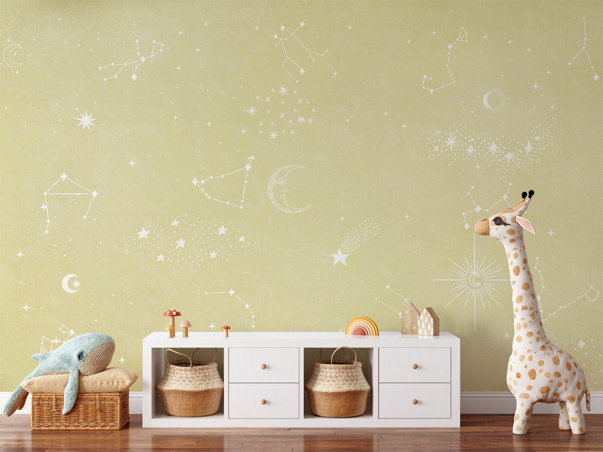 Introduce celestial elegance to your space with the Yellow Star Wallpaper Mural, featuring delicate constellations and star motifs on a soft yellow backdrop. This mural's gentle yet intricate design creates a serene ambience, perfect for adding a touch of the universe to your home. The artistic detailing provides a sophisticated view, suitable for enhancing the aesthetic of any interior setting.
