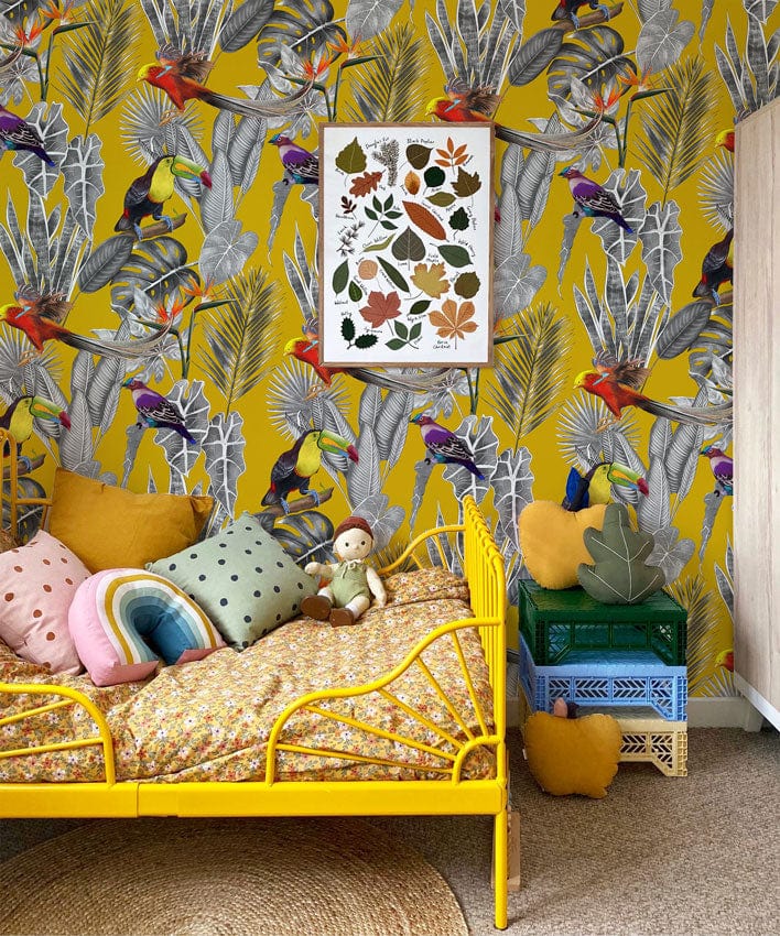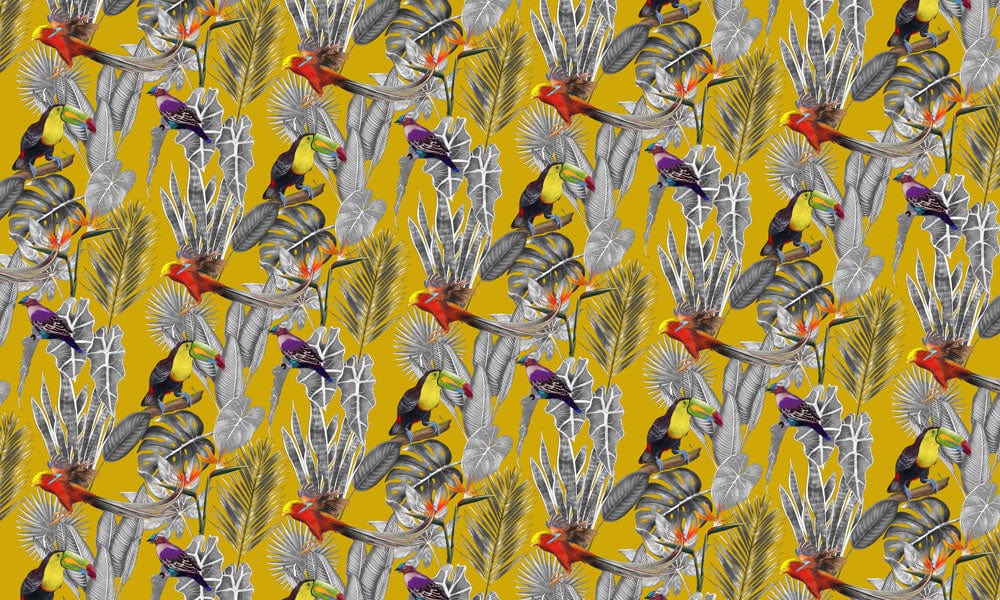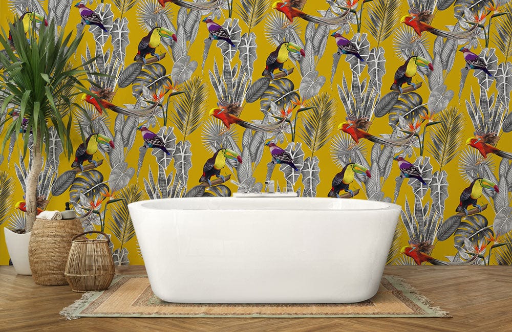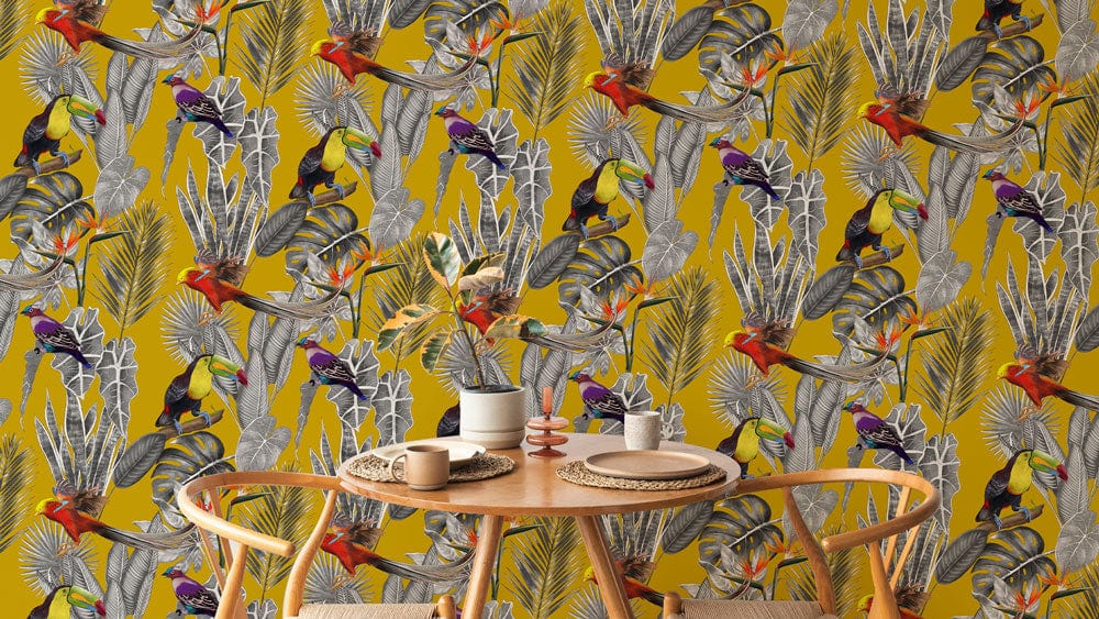 Immerse your walls in a vibrant tapestry of nature with the Yellow Vibes Wallpaper Mural. Featuring a lively display of tropical birds and foliage on a rich mustard backdrop, this mural brings a touch of exotic elegance. The intricate details of colourful feathers and lush leaves create a dynamic pattern that awakens any space with a sense of adventure and refinement. Perfectly balancing artistic detail and natural allure, this wallpaper offers a timeless charm that complements both contemporary and traditional interiors.