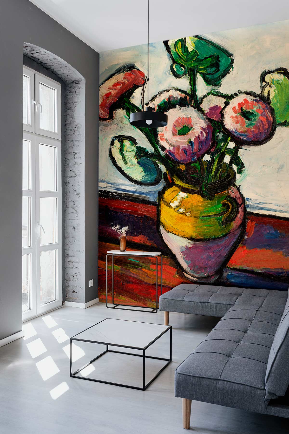 Fill your place with positivity with this lovely oil painting mural wallpaper for zinnias flower in vase in bohemian style and make your home speak out modernity. This colourful wallpaper is going to boost the energy at your walls and make your space look fresh and full of life. Style this wallpaper with plain chiffon curtains and black or grey fluffy carpets. This wallpaper will be perfect at literally everywhere. Use it at your living room for a cool modern style and style it with modern couches, or at your kids鈥?room with modern wooden white furnishing to make their room really happy and chic.